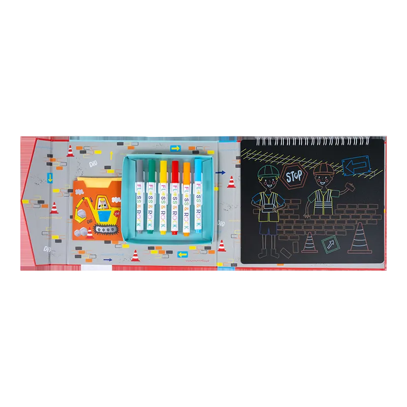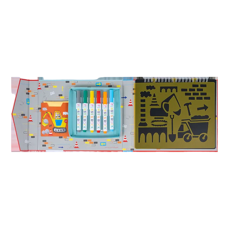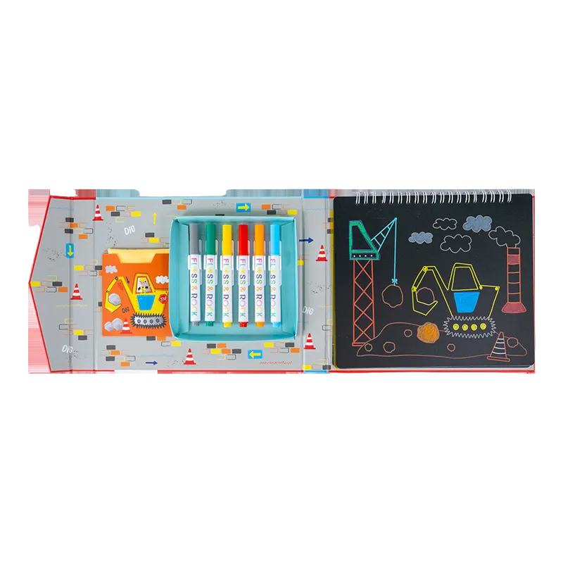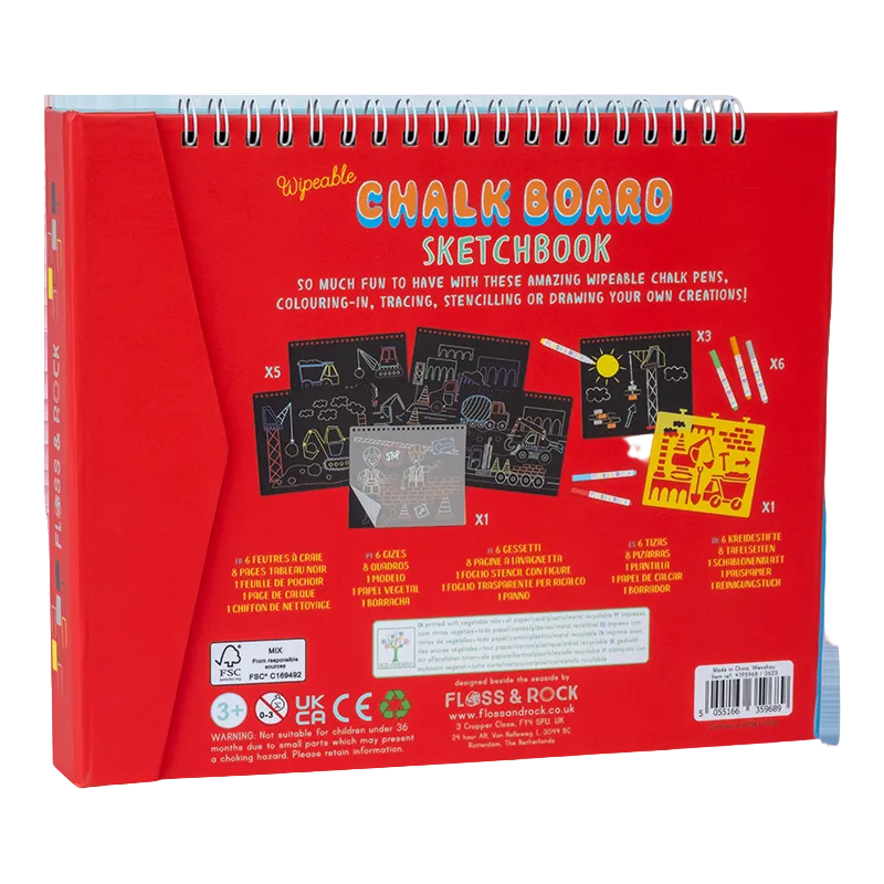 Chalk board fun in a wipeable sketchbook format! This brilliant Construction Chalk Board Sketchbook contains 8 pages. 5 pages with ready to colour-in illustrations featuring builders, diggers, trucks and more, plus 3 plain pages ready for freestyle doodling! There's also a tracing sheet and a super, Construction themed stencil sheet. Both these sheets can be removed and clipped into the spiral book bind whereever you choose! The sketchbook comes with 6 coloured chalk pens and a handy cleaning cloth to wipe the pages clean when you're finished, ready to start again and continue with your creativity next time! The pages are printed with vegetable inks and all of the paper, card, plastic and metal contents are recyclable.