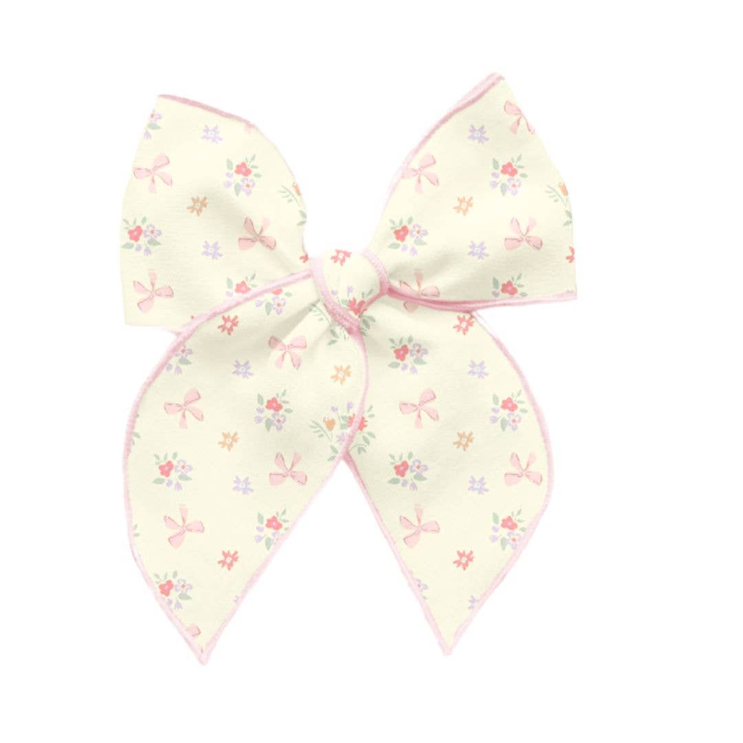 - Pastel yellow bow with a multicolor floral and bow print pattern