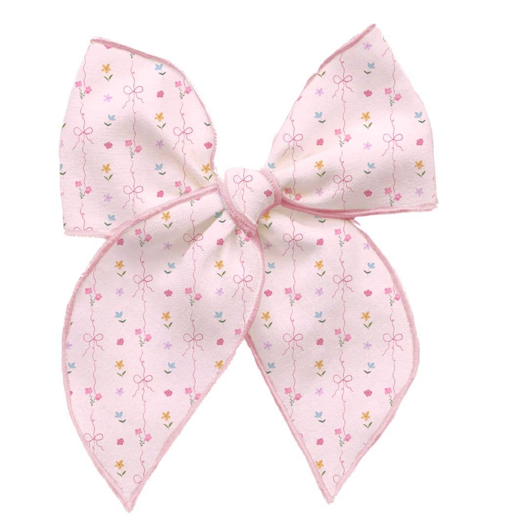 - Soft pink bow with a multicolor floral and bow print pattern