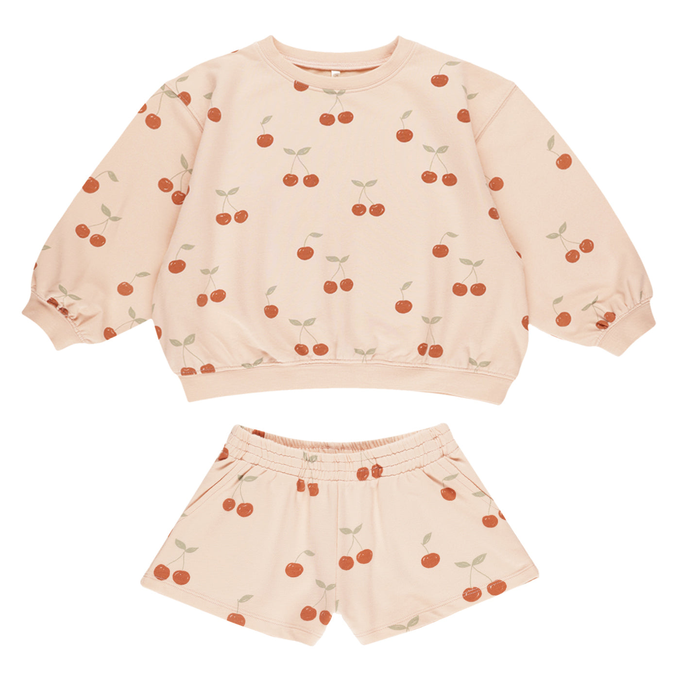 A relaxed sweatshirt and matching shorts with pockets and an elastic waistband come together in this cozy french terry summer set.