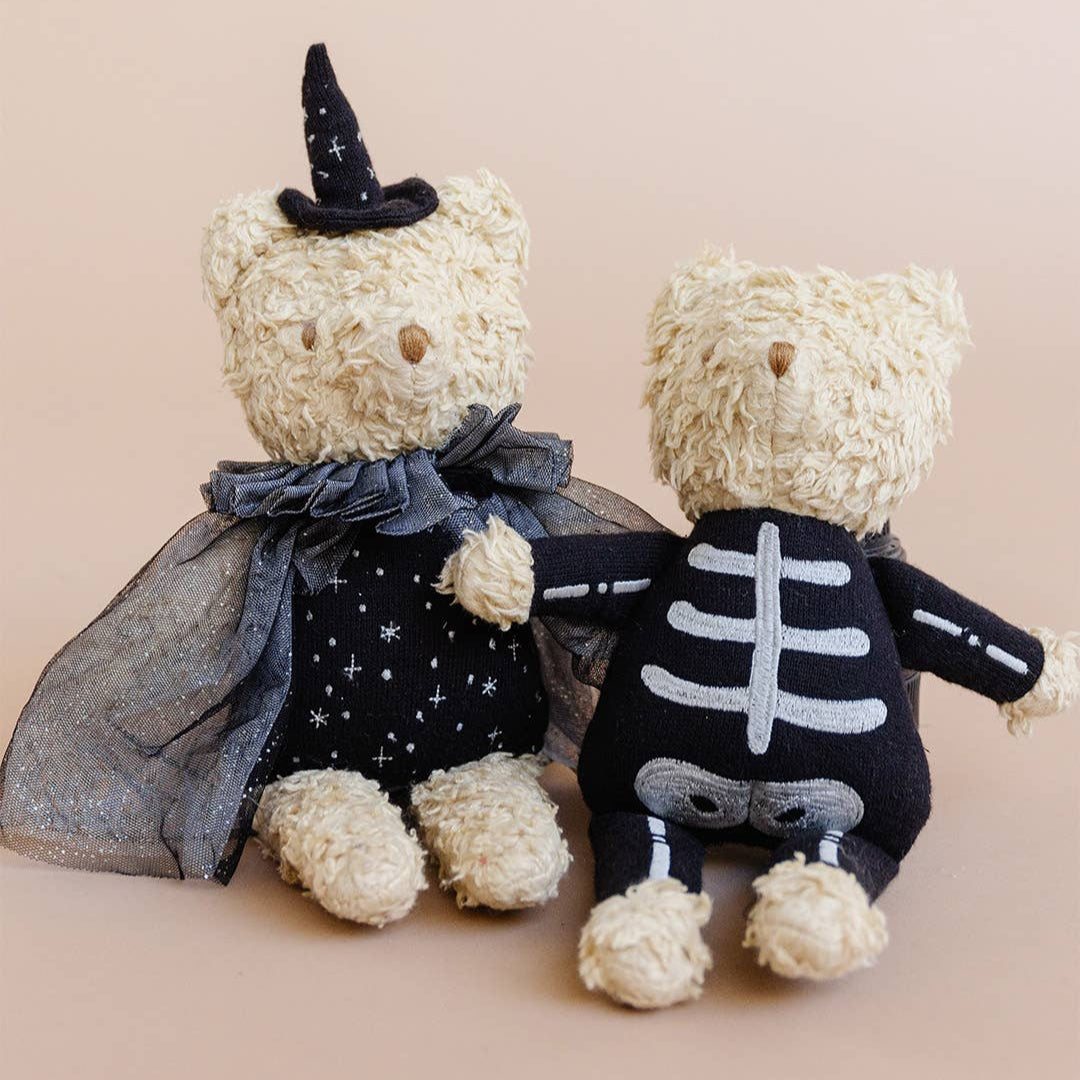 Double your trouble with Witch Bear! She's got her cauldron boiling and bubbling, and is ready to go trick-or-treating. Gift with our Black Popcorn Cardigan, Orange Rattle, or send shivers with our Skeleton Bear.