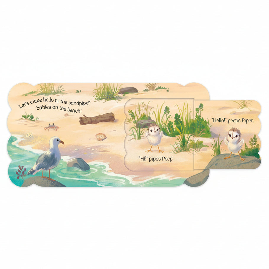 Come play on the beach with some sandpiper babies named Peep and Piper! Introduce your baby or toddler to ocean animal babies including turtles, manatees, crabs, and some tide pool friends in this adorable lift-a-flap board book. Sweet illustrations and engaging interactions between animal characters reinforce a child's interest in the story, while grasping and lifting the sturdy flaps helps develop fine motor skills. A perfect first book!