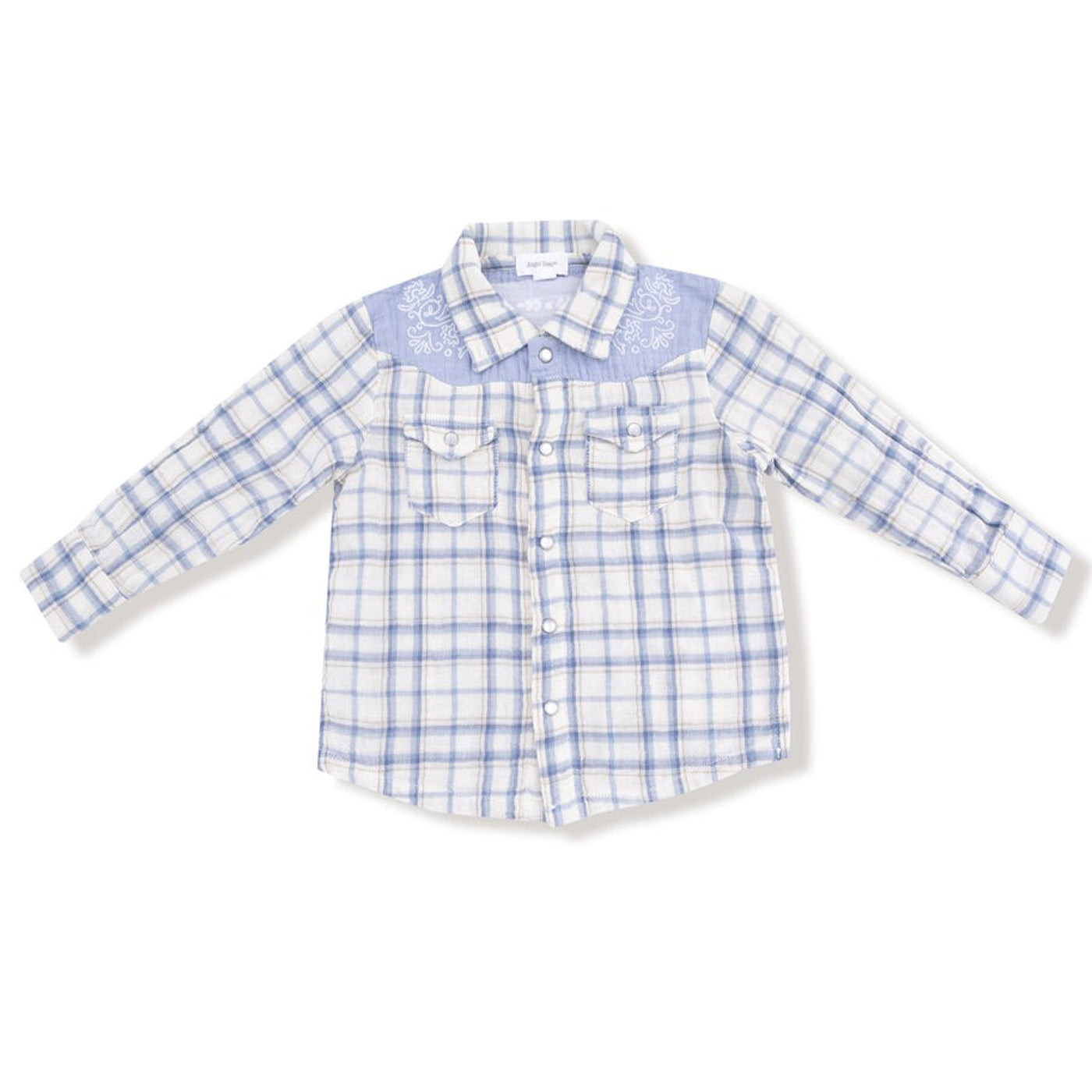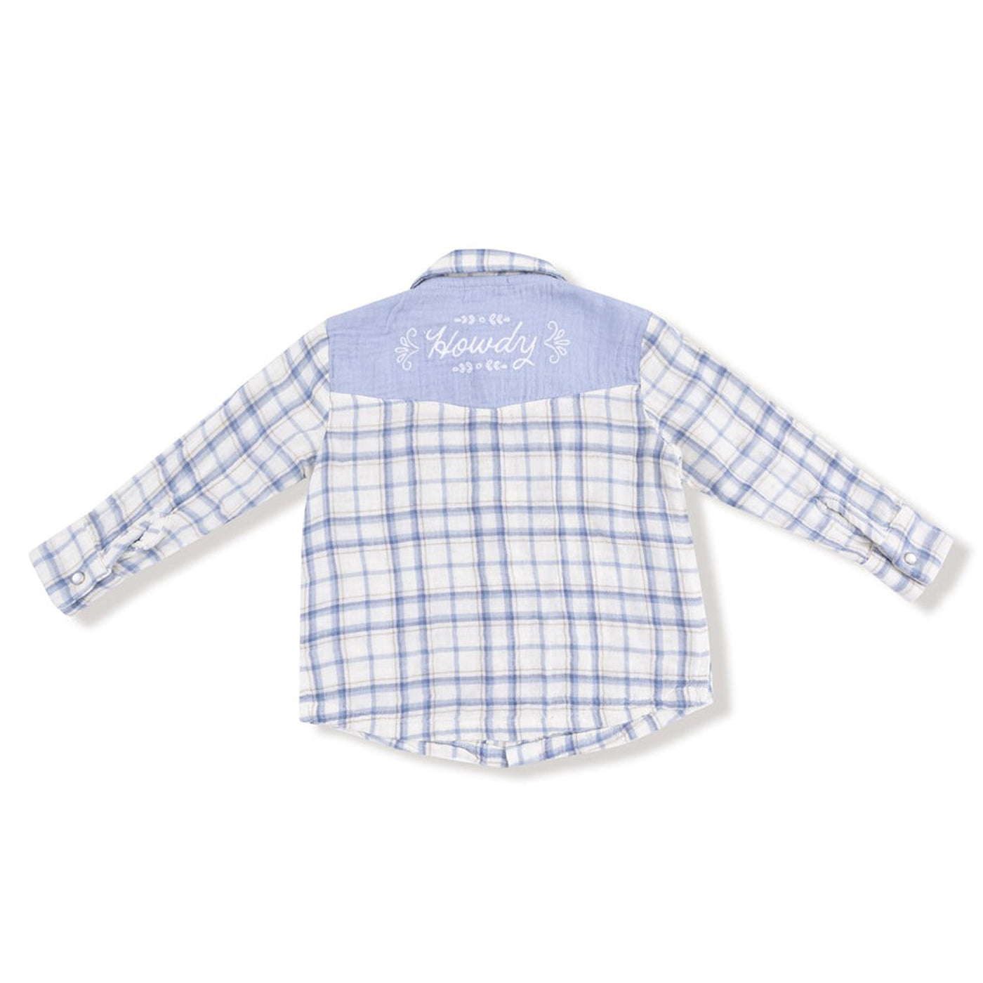 Bring a little cowboy charm to chilly days with our Long Sleeve Western Pearl Snap Shirt, crafted from soft organic cotton muslin. Featuring classic pearl snaps and a bold “Howdy” embroidery on the back, this shirt is perfect for your little wrangler’s fall and winter adventures.