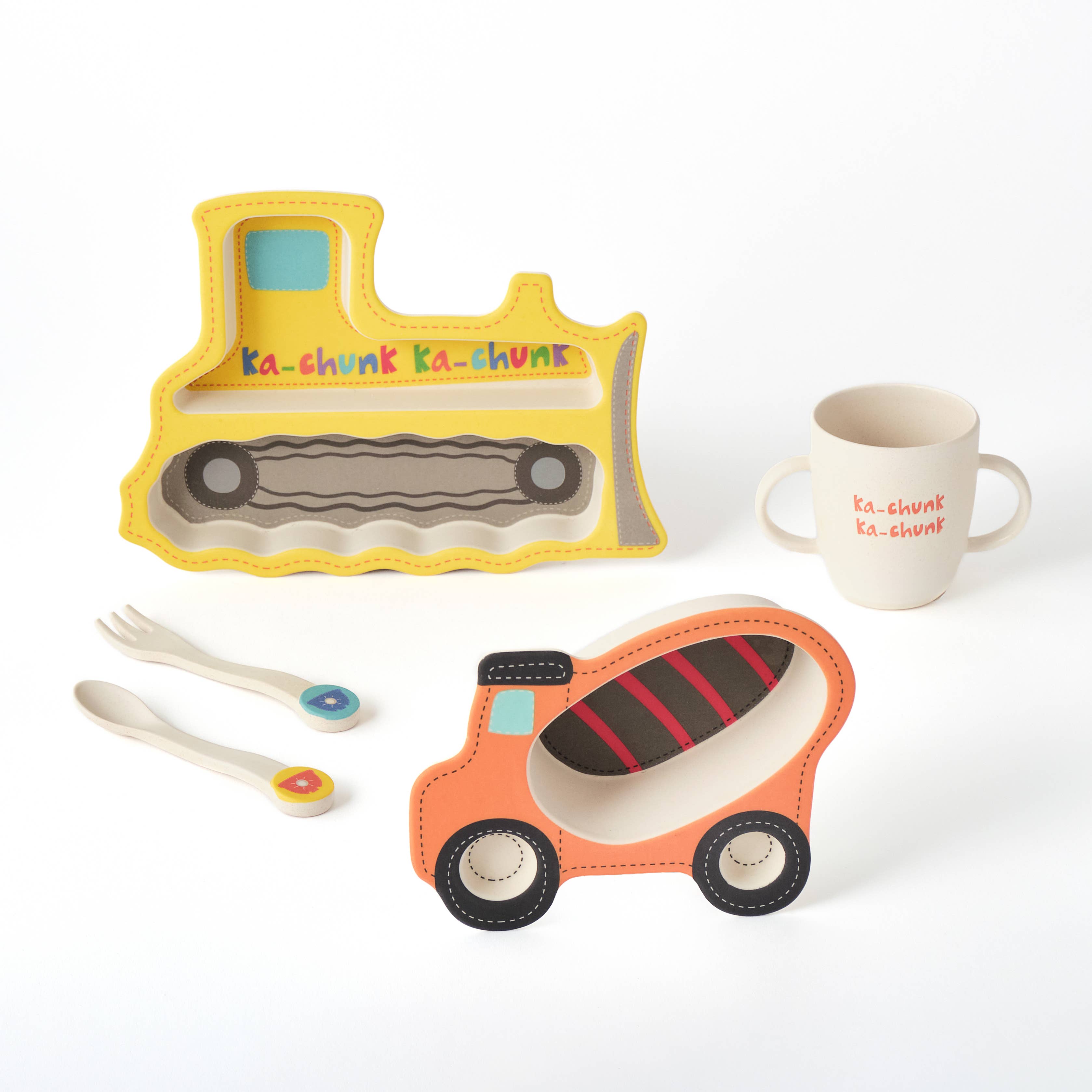 The construction team is hard at work! Make meal time fun with this dinner set featuring a bulldozer plate and truck shaped bowl. Also comes with cup, spoon, and fork!