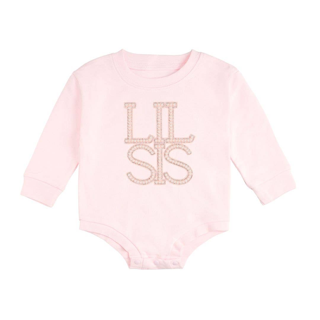 The Lil Sis Pearl Patch Long Sleeve Romper is a great way to celebrate a new little lady who has joined the family!