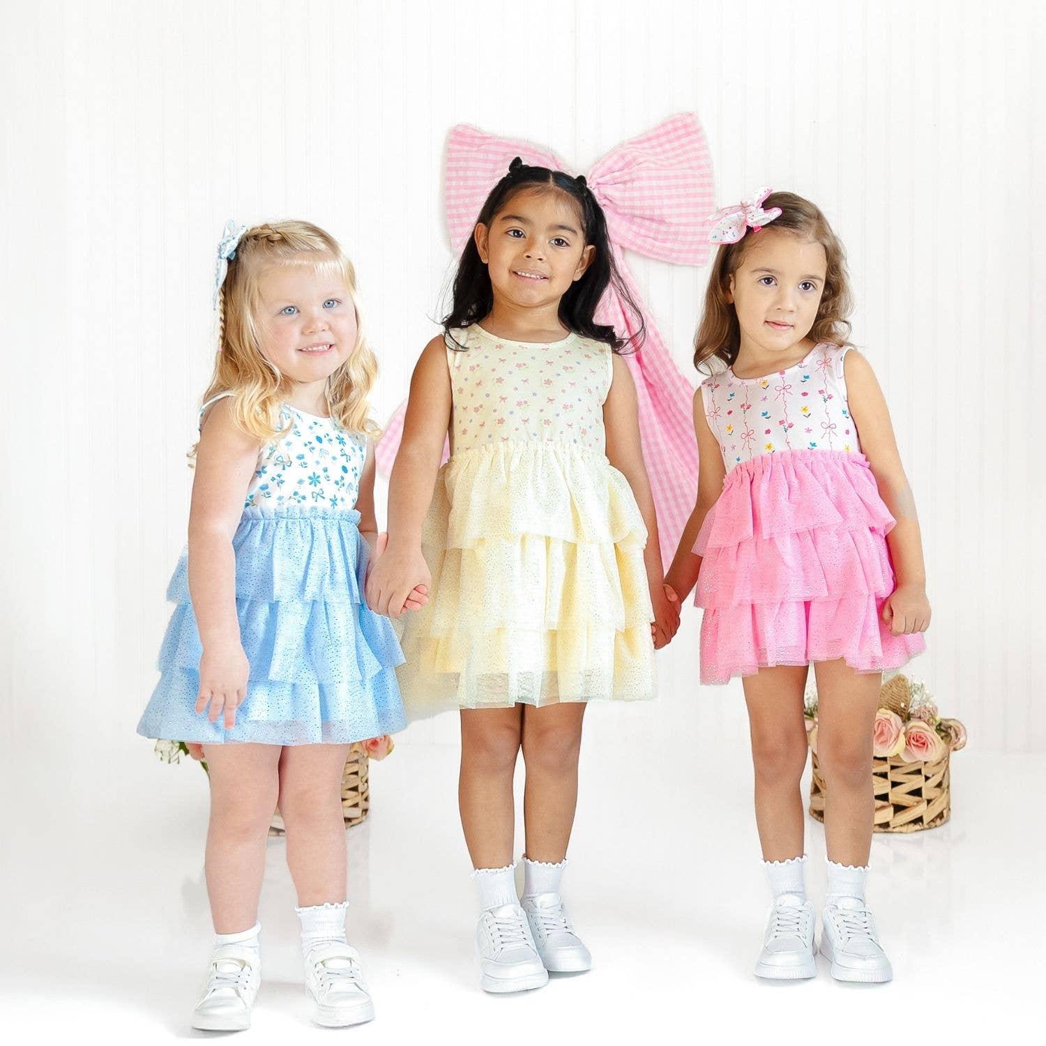 - Color: Pastel yellow cotton bodice with multicolor floral and bow print pattern and a yellow tulle skirt overlay accented with glitter pin dots