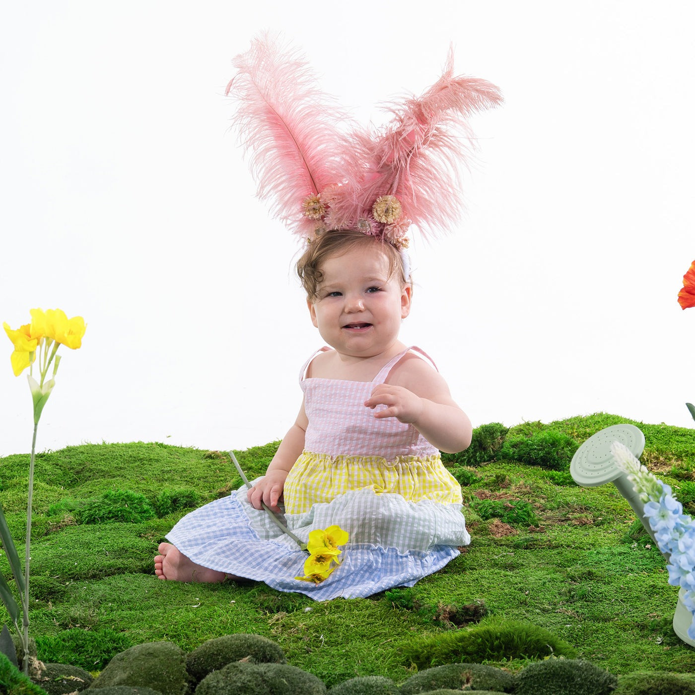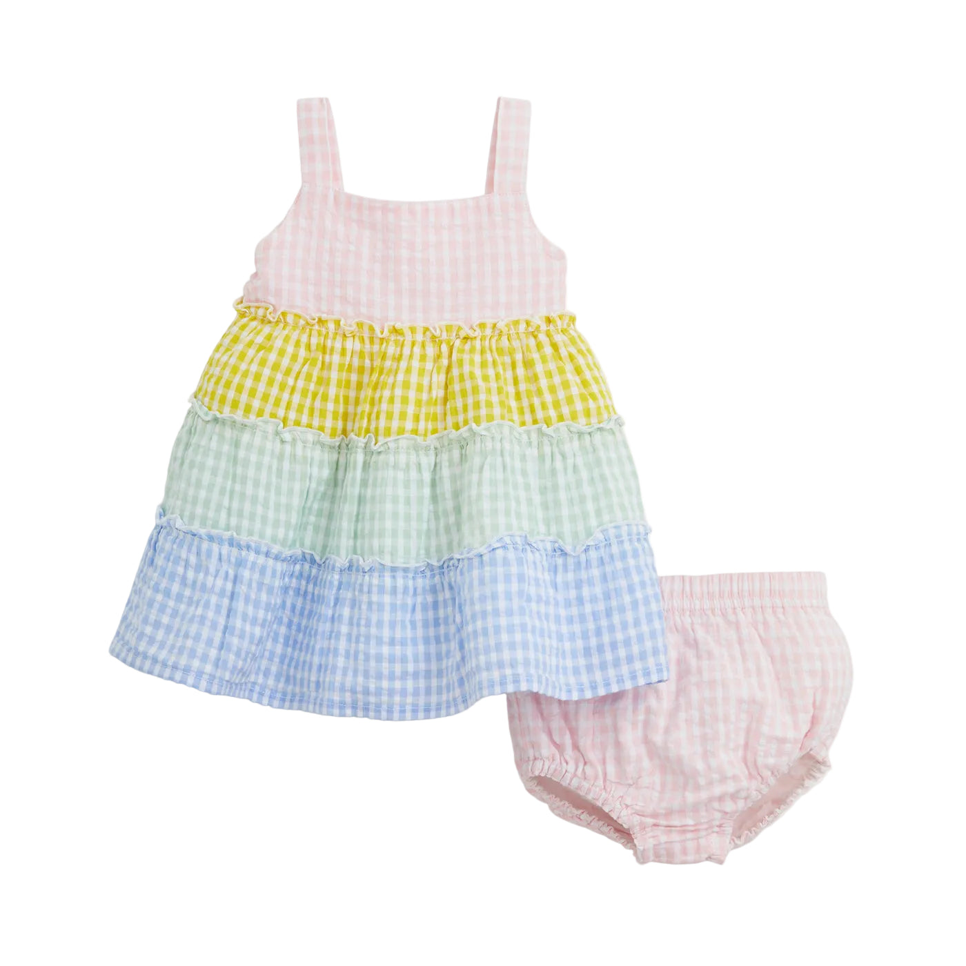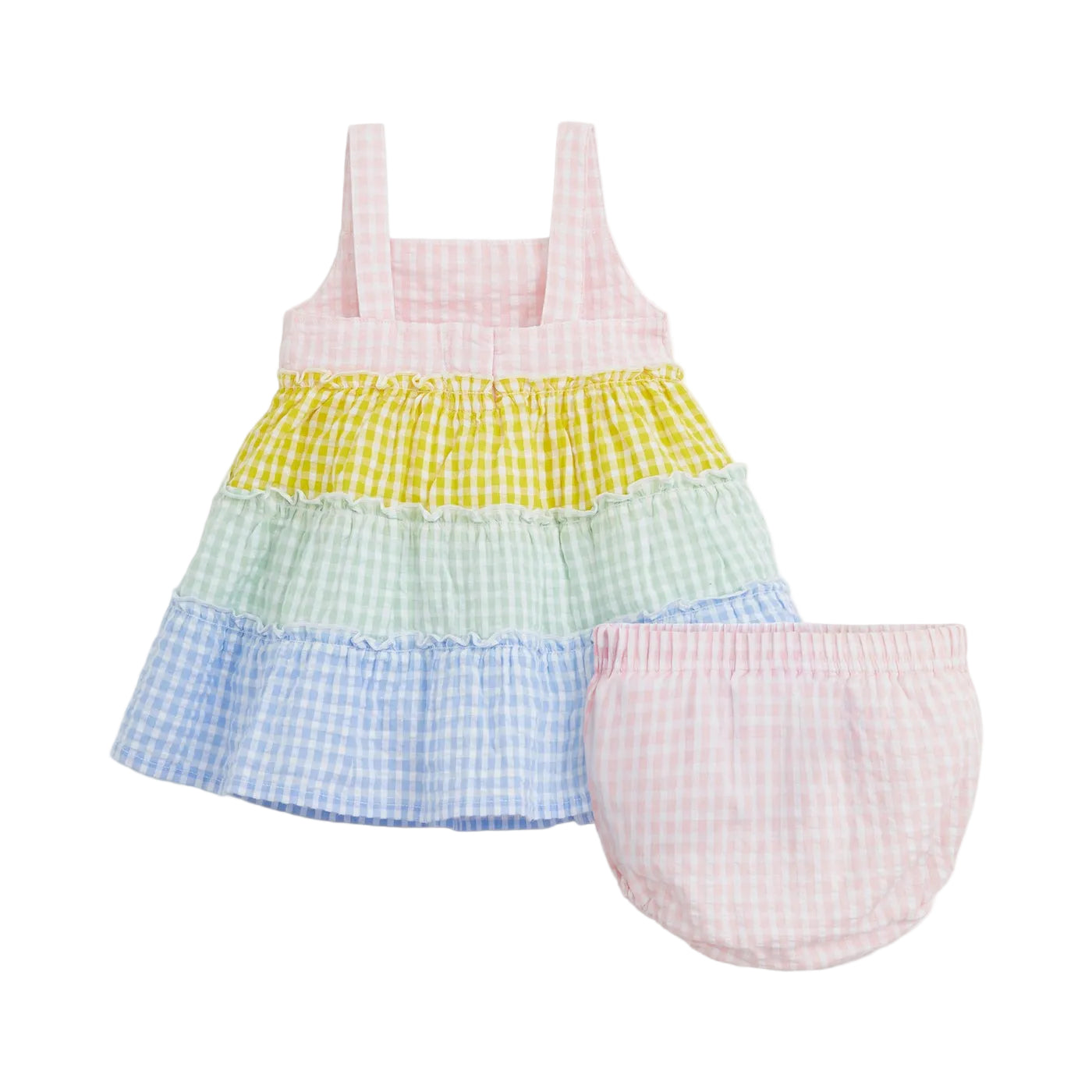 Our A-line Dress & Diaper Cover set makes dressing easy and fun, with a swishy tiered skirt and magnetic closures at the back. This set comes in lightweight cotton woven with a puckered texture—a fabric that’s washable for every day yet special for family parties and vacations.