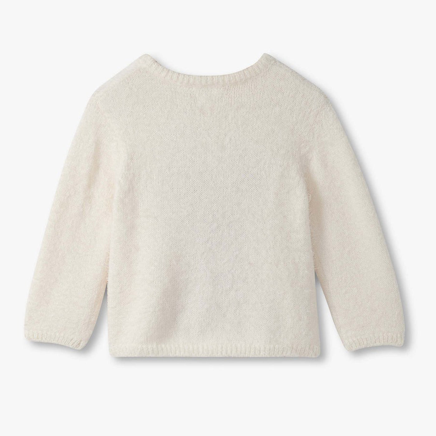 The Baby & Toddler Girls Reindeer Furry Sweater is a cozy holiday staple, knit from a soft, hairy nylon blend yarn for warmth and texture. With a creamy white base, this long-sleeve sweater features ribbed trim at the neckline, cuffs, and hem for a snug fit. The highlight is an adorable reindeer motif in shades of brown and white, complete with dark brown antlers and a festive red-and-white striped scarf. Crafted with textured yarn for a fuzzy, 3D effect, this sweater blends comfort with playful holiday charm.
