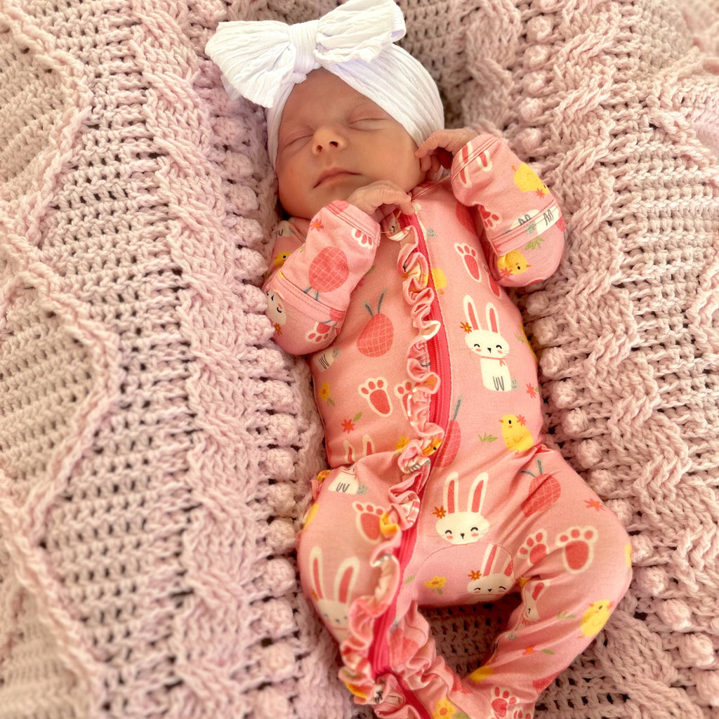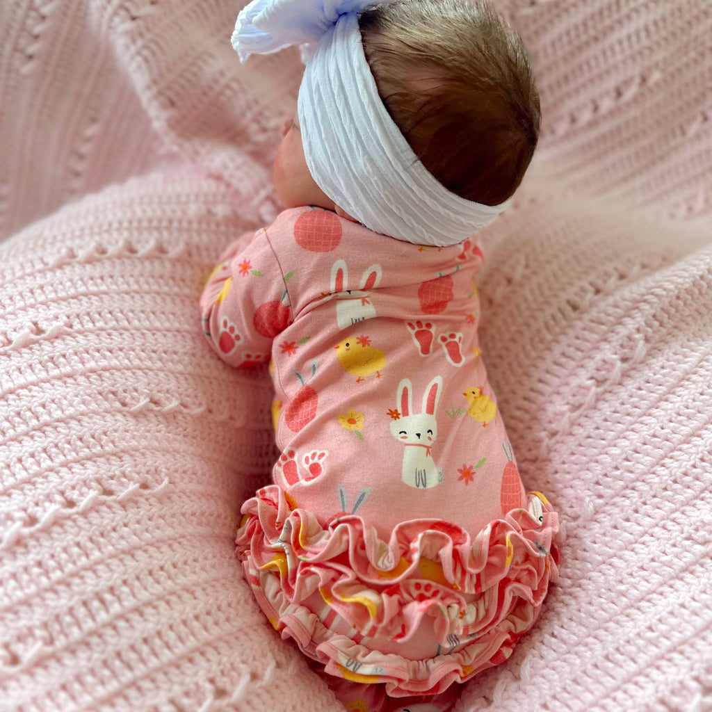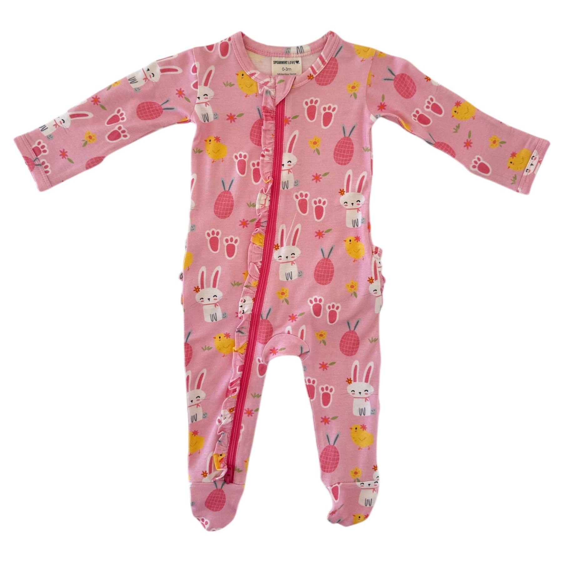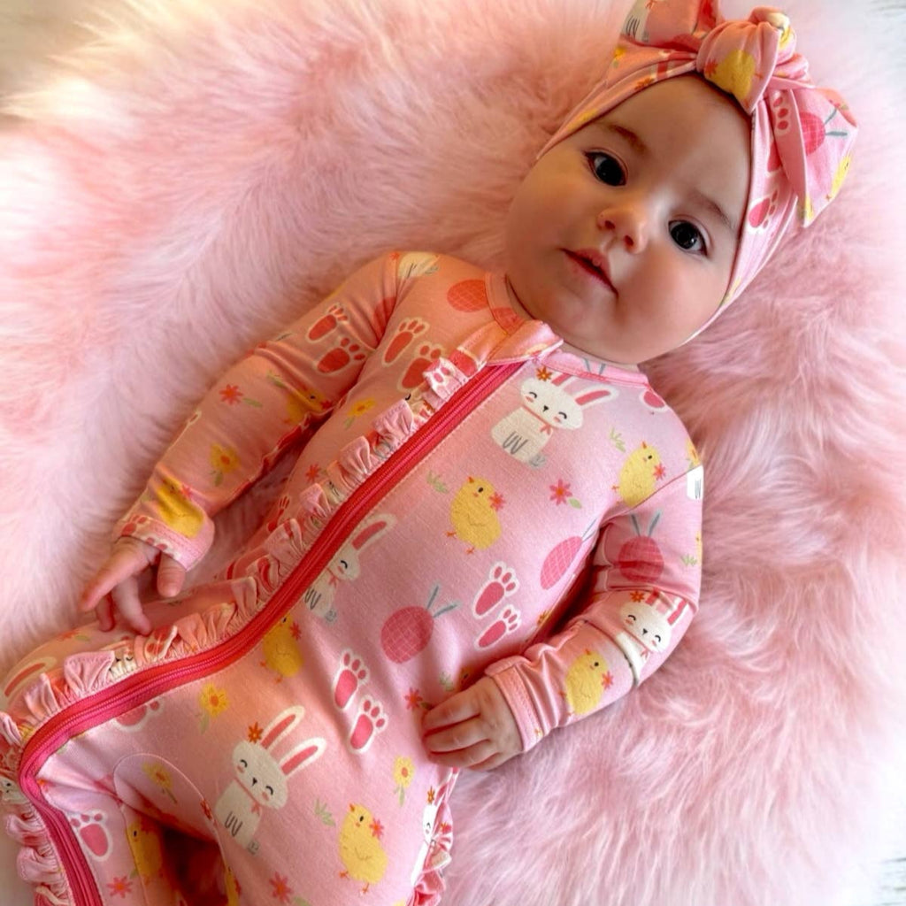 Dress your little one in the ultimate Easter cuteness with the 2-Way Ruffle Zip Footie. This delightful footie combines comfort, style, and a touch of holiday magic. Featuring a charming Bunny and Chick print in soft pink tones, it’s perfect for cozy snuggles, playtime, or festive photos. Crafted from soft, breathable viscose from bamboo, this footie will keep your baby feeling as loved as they look!