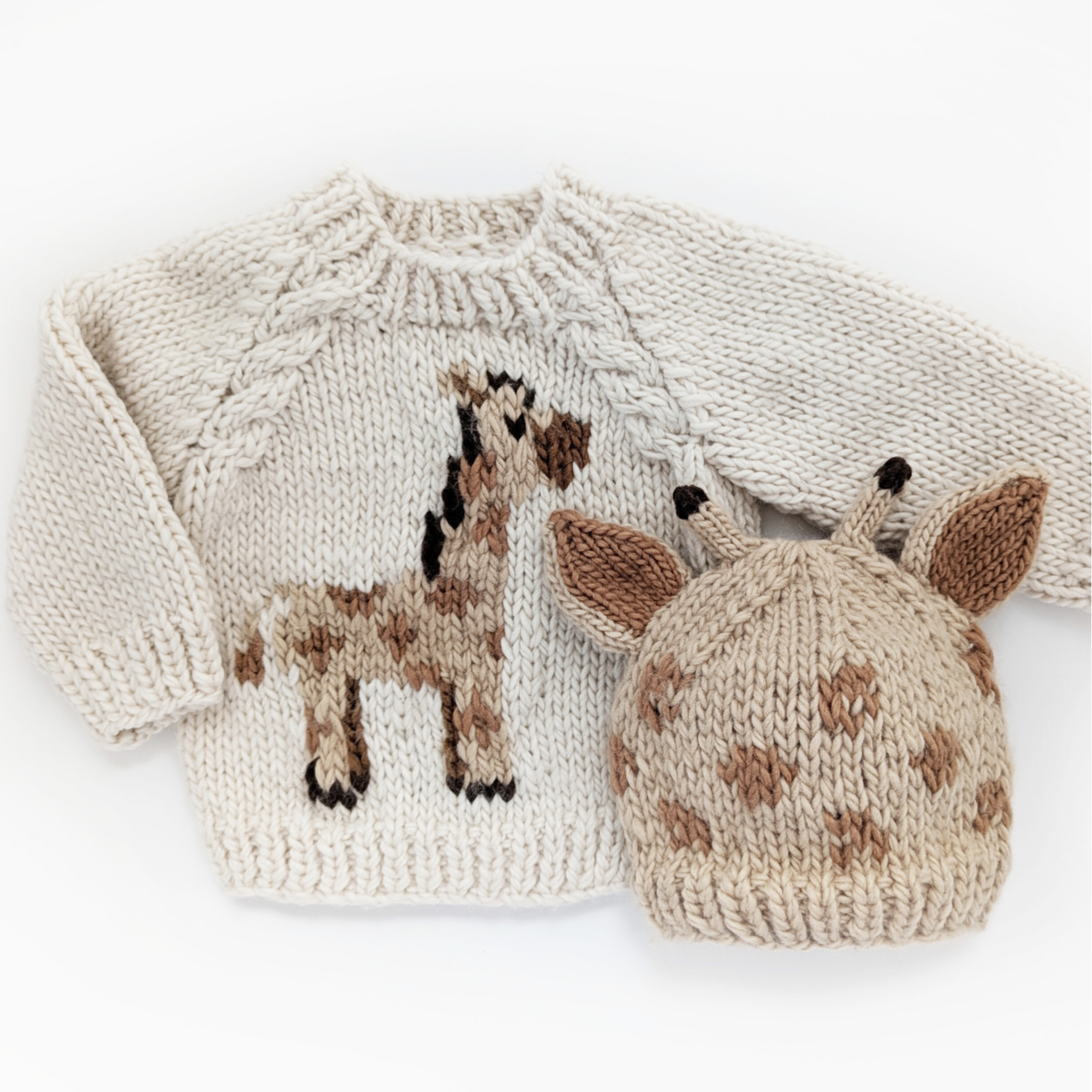 Keep your little one snuggled up in style with this cozy, hand-knit Giraffe Sweater. Not only will it make them look absolutely adorable, but the raglan sleeves and cable details make for a unique and fun twist. Don't forget to complete the look with our coordinating Giraffe Beanie Hat! Our sweaters are partially knit from recycled, sustainable Polyester yarn made from plastic bottles.