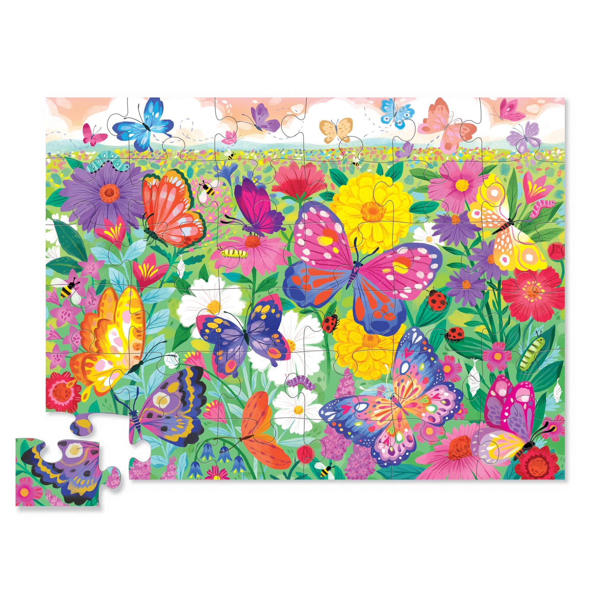 Butterfly Garden is a 36 piece floor jigsaw puzzle will delight all ages and little kids who love butterflies! The 18" X 24" Floor puzzle is not only significant in size but also has beautiful, colorful and complex illustrations. All Crocodile Creek puzzles are printed with soy-based ink on recycled cardboard. Uniquely shaped storage box is study and will keep all the pieces together when the puzzle is not in use. * 36 thick puzzles pieces that fit together well for kids ages 3 and up. * Encourages hand-eye coordination, fine motor skills and problem solving. * Puzzle pieces are made of strong, high-quality blue board that will not tear or break. Printed with soy-based inks. * Beautifully illustrated artwork on both puzzle and shaped storage box.