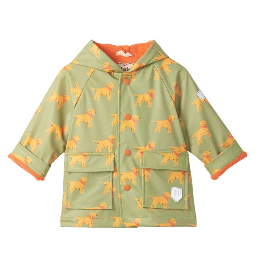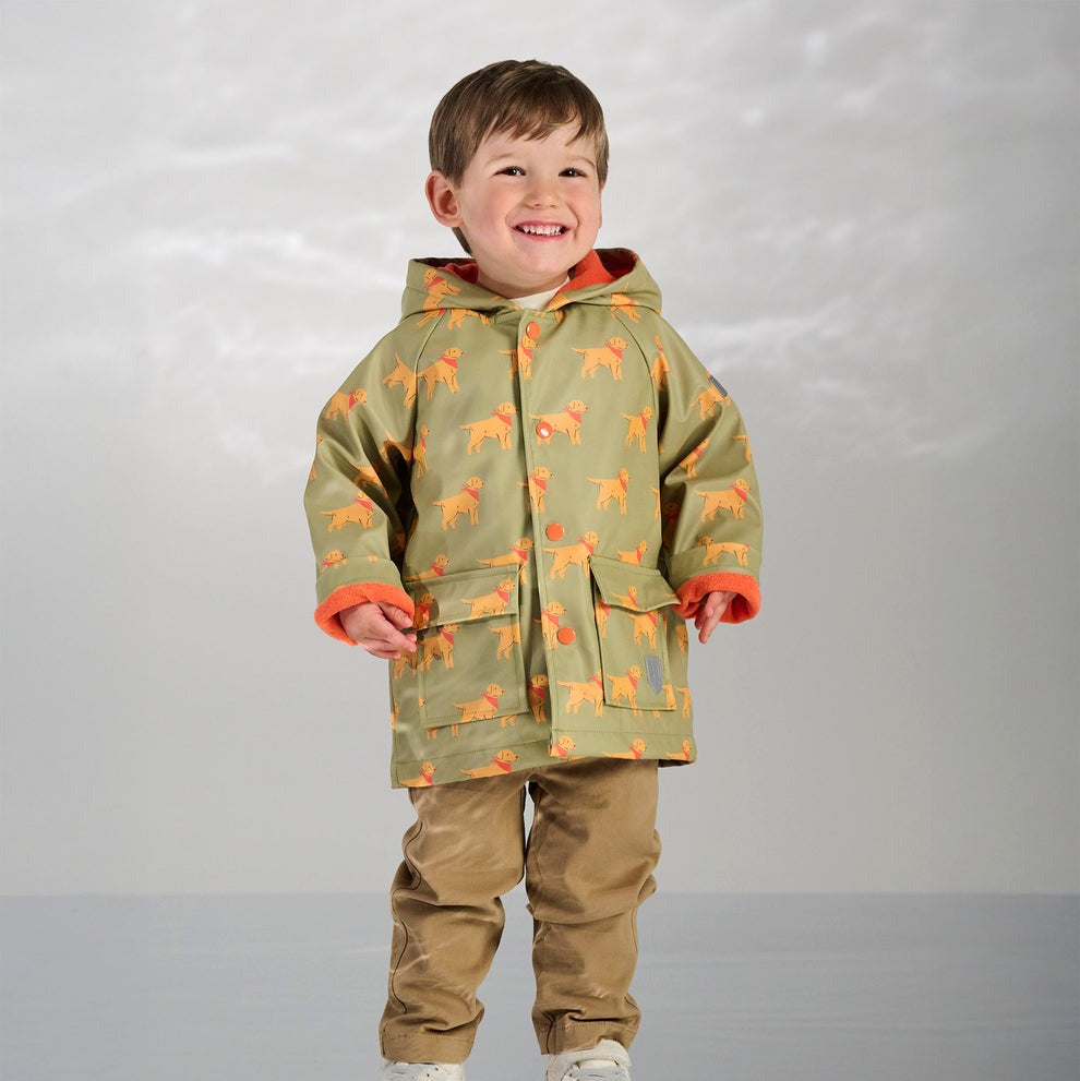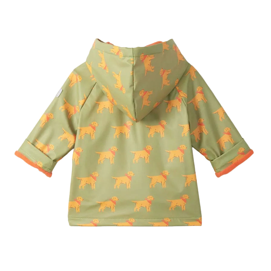 Bring a little tail-wagging joy to their rainy days with this layer! Featuring an all-over dog print on a soft sage-green background, this waterproof jacket is lined with cozy, soft fabric to keep little ones warm and comfy. The lining and accents are a warm orange that adds a playful pop of contrast, while a snap-button front and roomy front patch pockets make it as practical as it is fun. Perfect for puddle jumping, park strolls, and every soggy adventure in between.