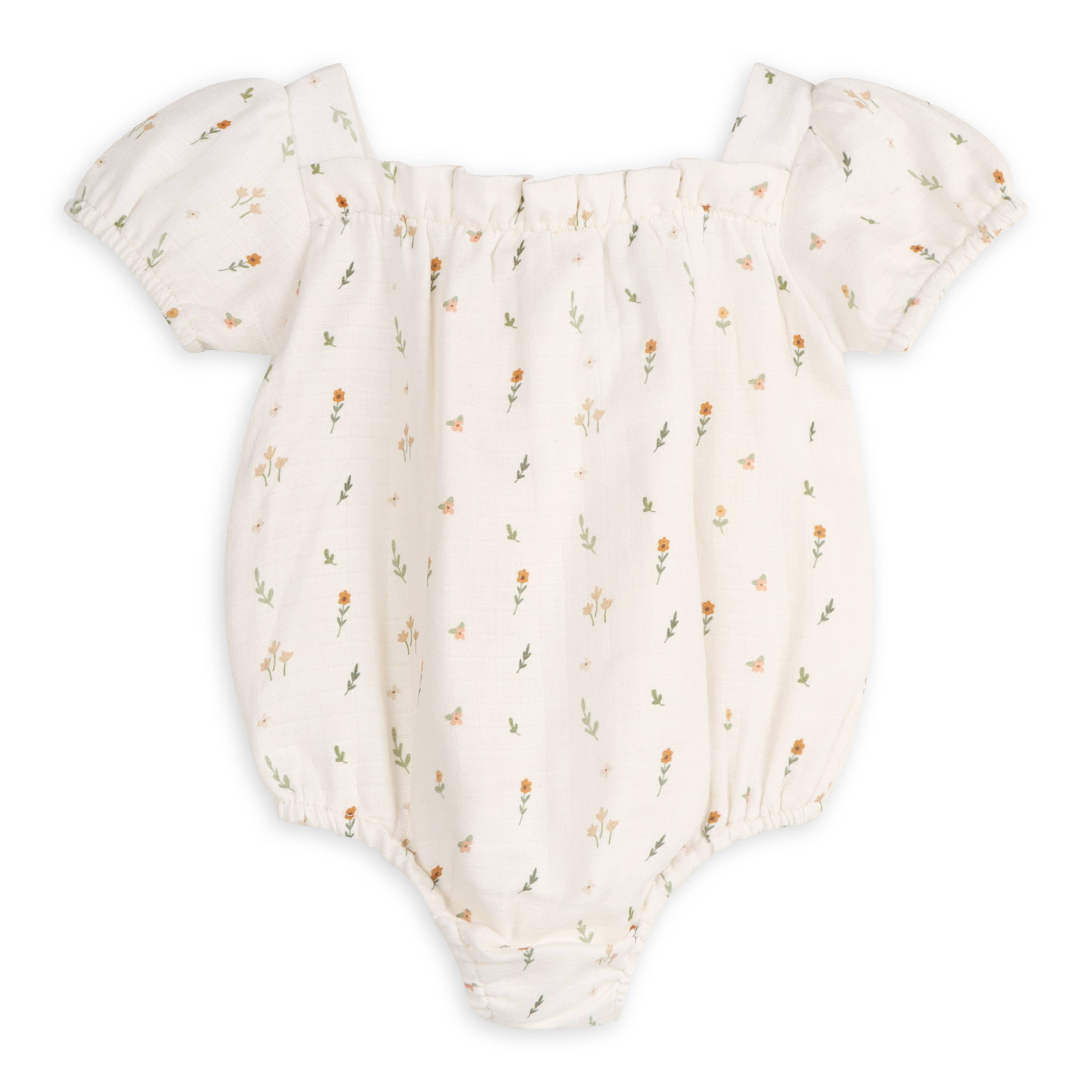 The puff sleeve floral romper for a baby girl features a beautiful bow in front and is made with ultra-soft organic muslin fabric. - Snaps around the crotch area for easy diaper changes. -