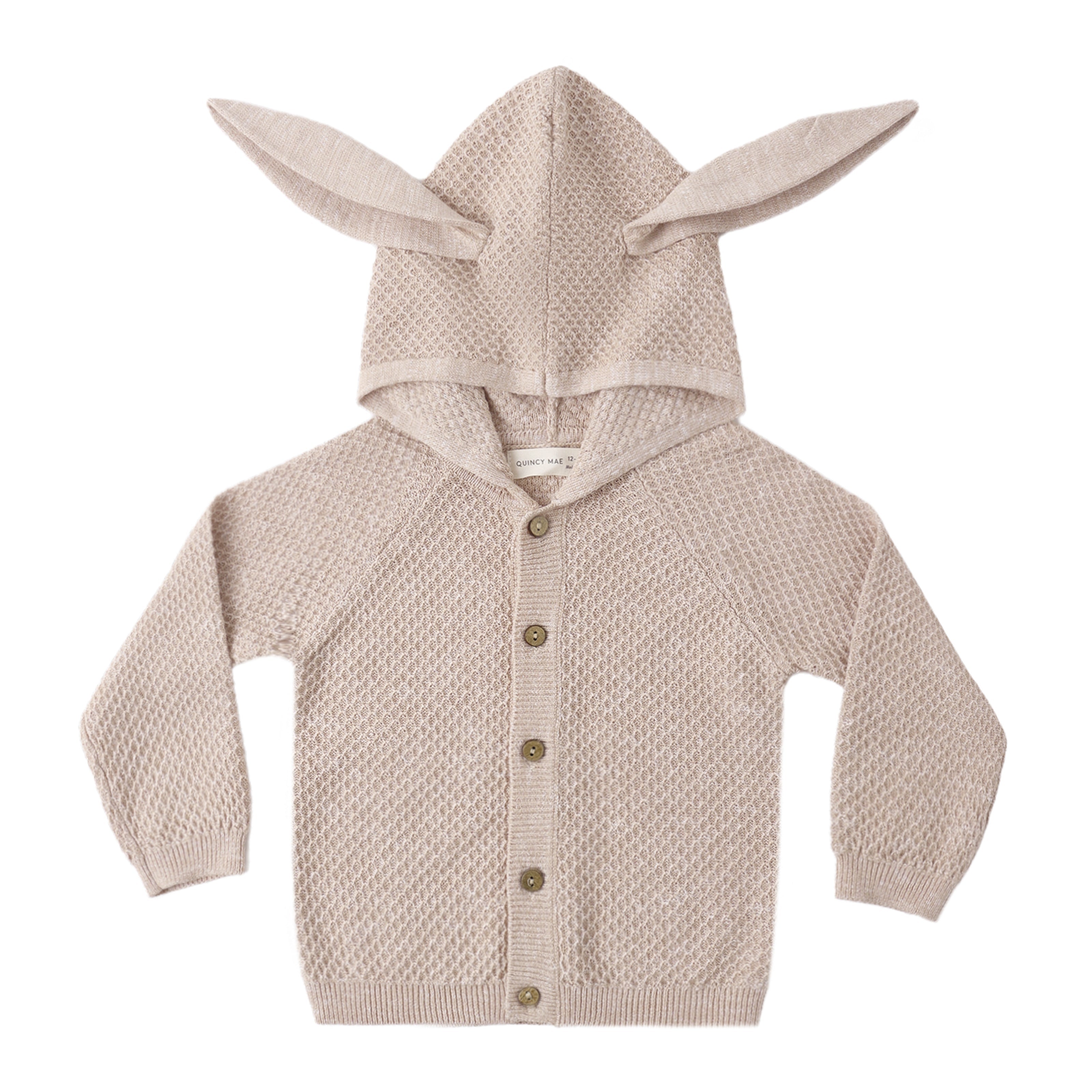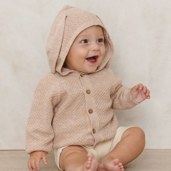 Hop into spring in our Bunny Knit Sweater. This hooded sweater features floppy bunny ears and coconut buttons down the front.