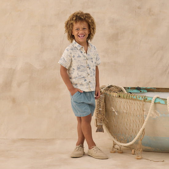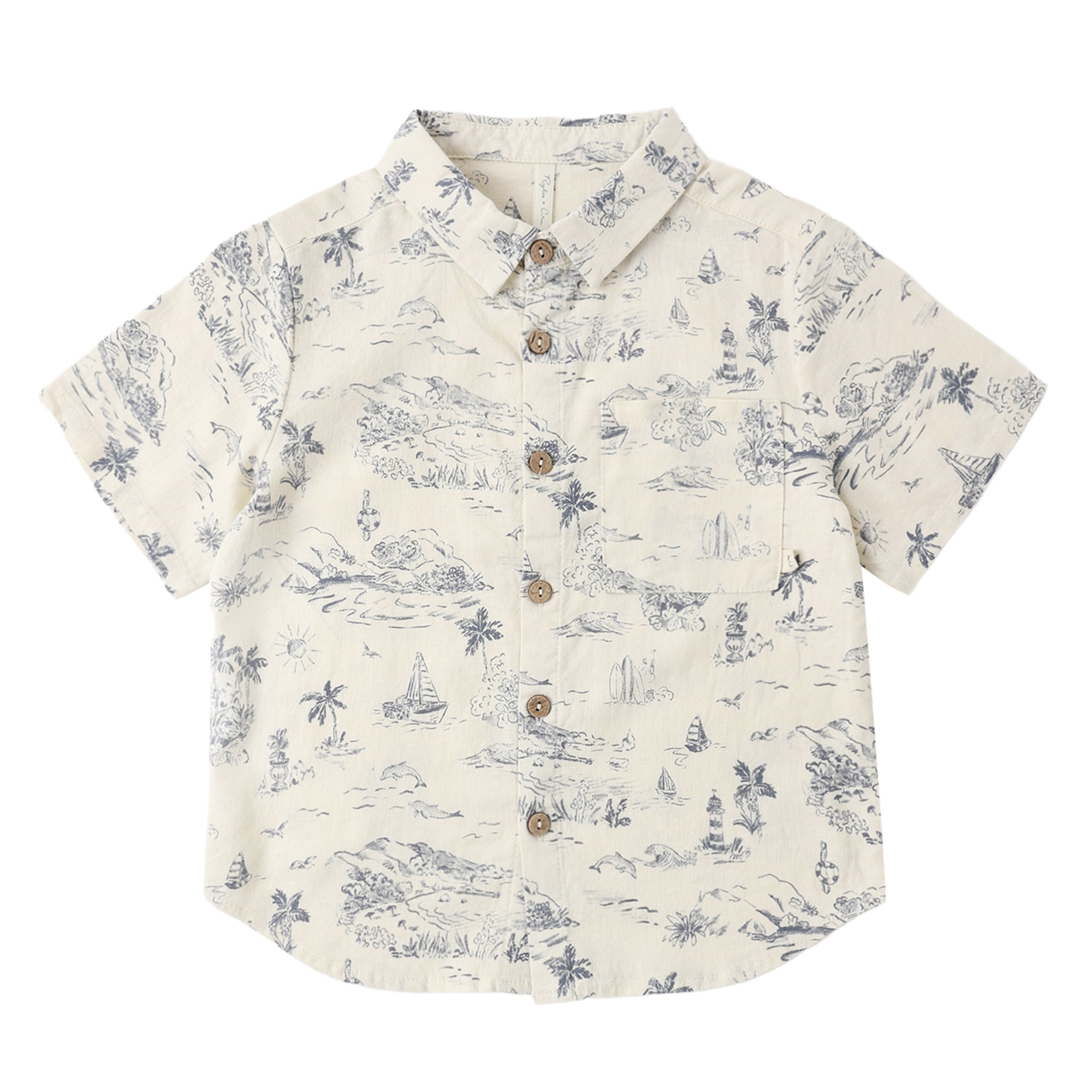 • A classic collared boys short sleeve button-down shirt with coconut buttons.