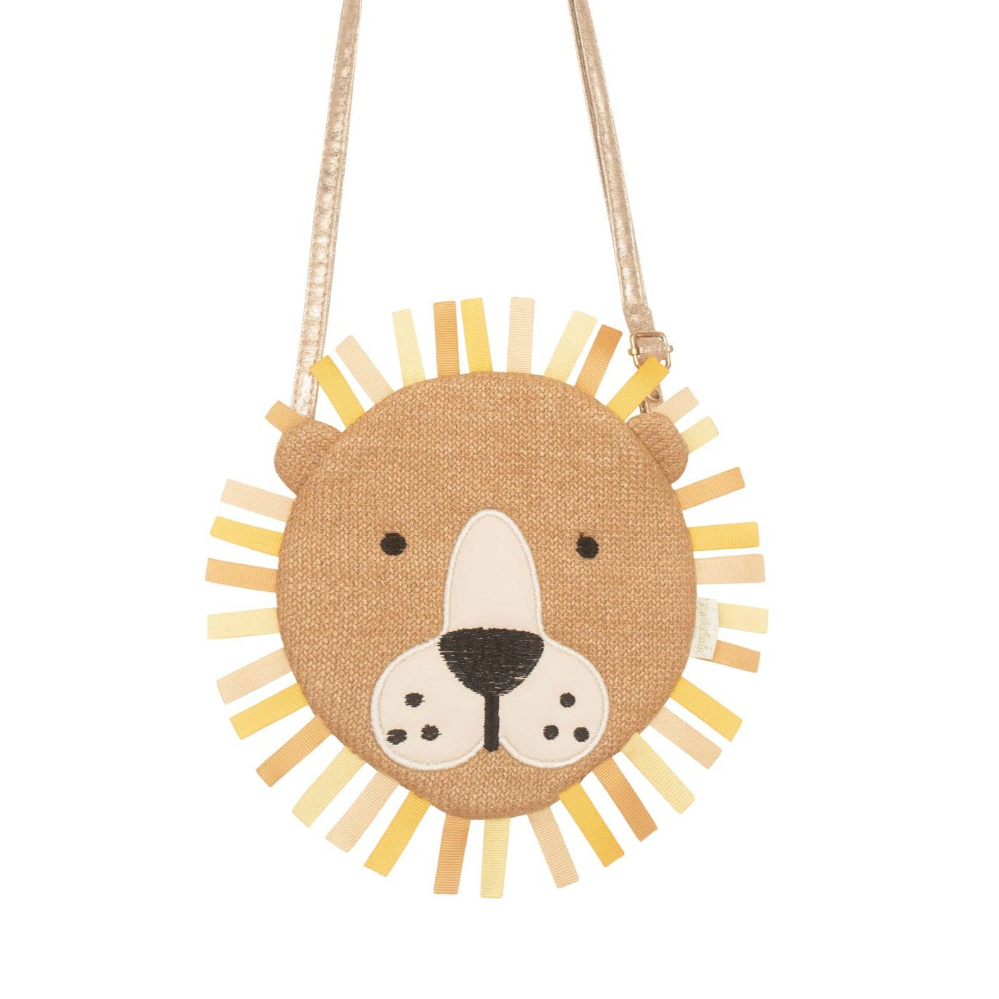 This roar-some lion bag is made for little explorers and animal lovers. Made from a neutral textured fabric with a charming face detail and a yellow and golden grosgrain ribbon mane. This bag features a magnetic dot closure, brown spotty lining and an adjustable gold strap with a break point for safety. Matching hair accessories and socks also available. Bag dimensions: 18.5cm x 15cm x 1cm. Not suitable for children under 36 months due to small parts.