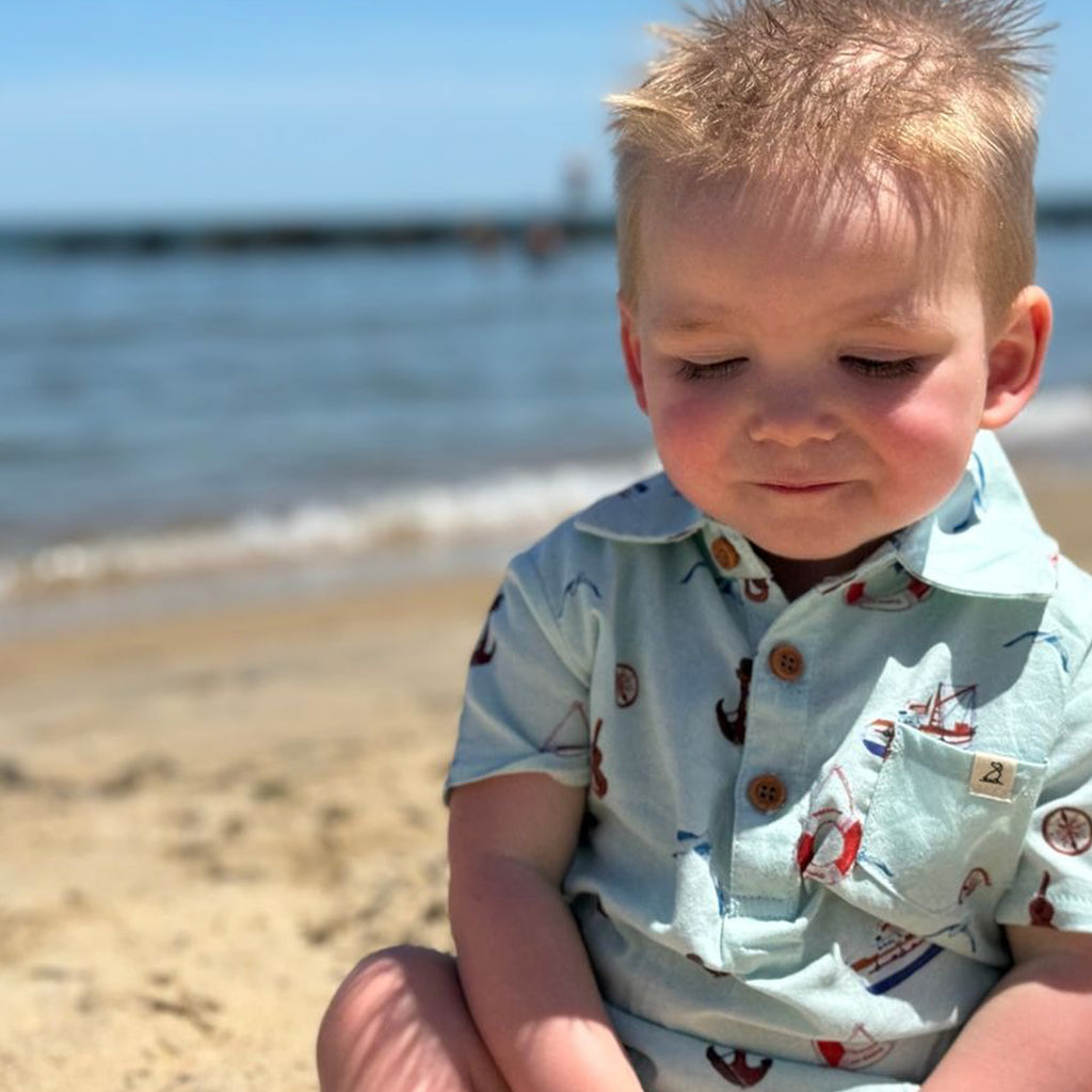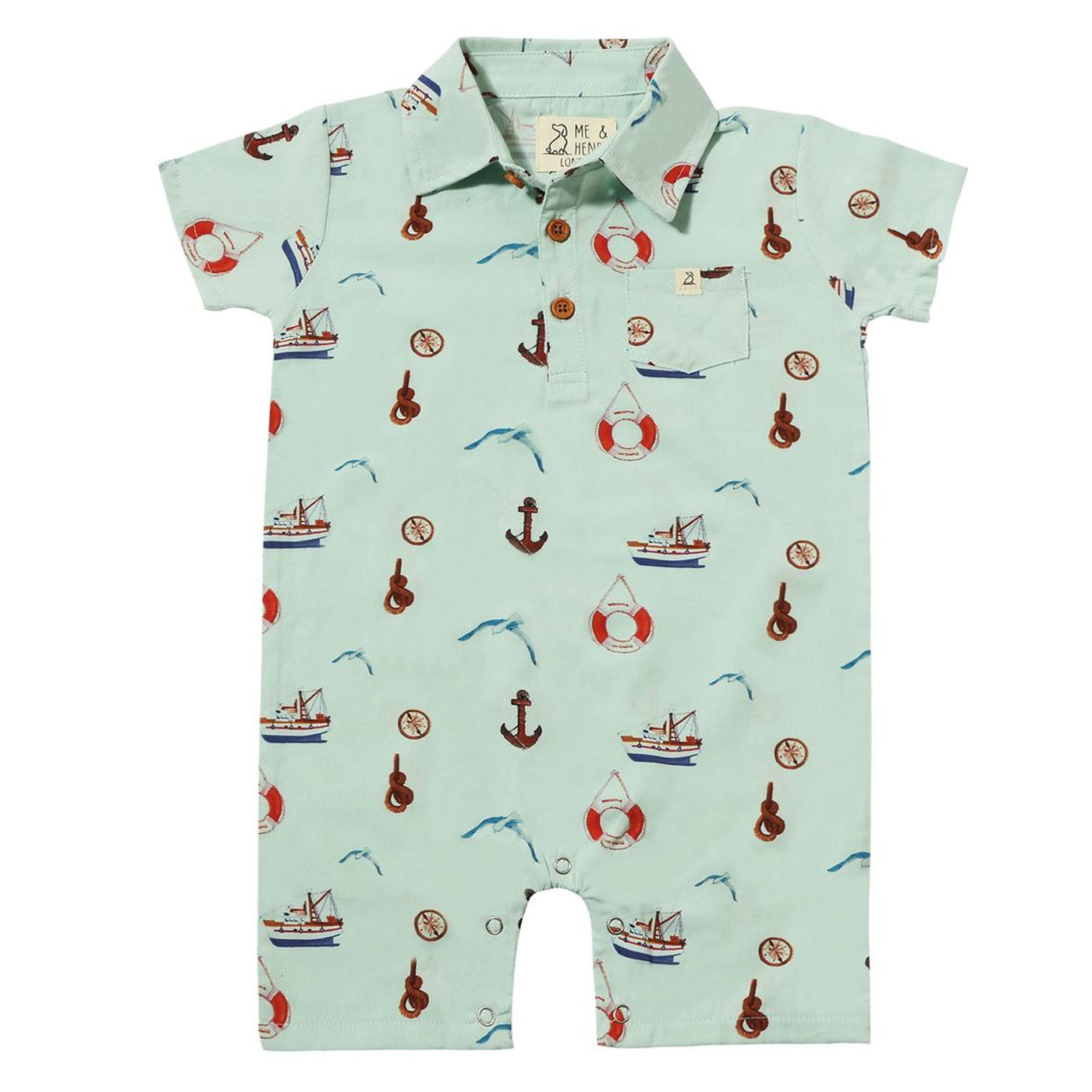 Set sail for adventure with this charming blue nautical printed romper, designed to bring coastal vibes to your little one's wardrobe.