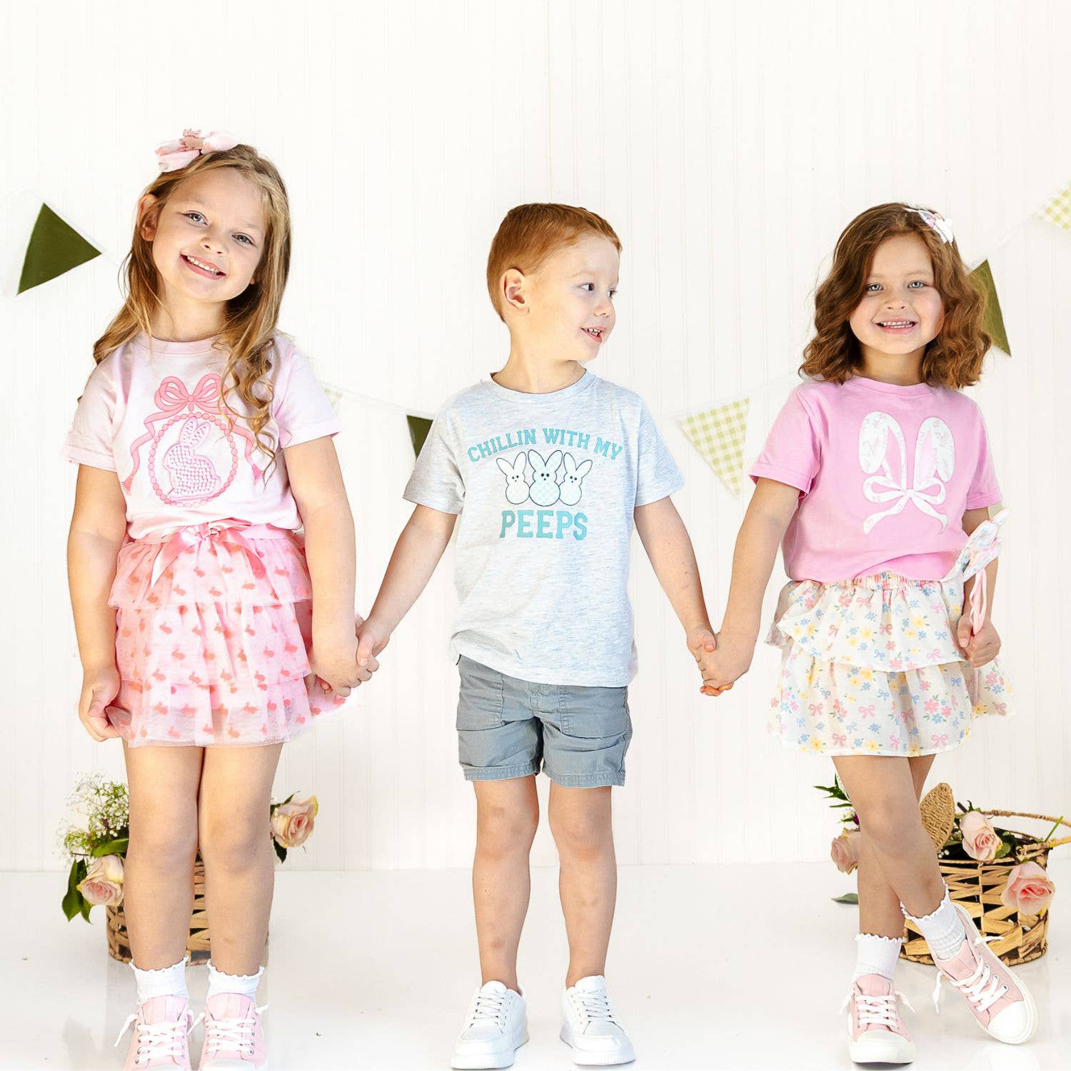 Ready for fun, this adorable tiered skort features a comfy smocked waist and a cheerful springtime print of delicate flowers and sweet pastel bows, perfect for play and twirling.
