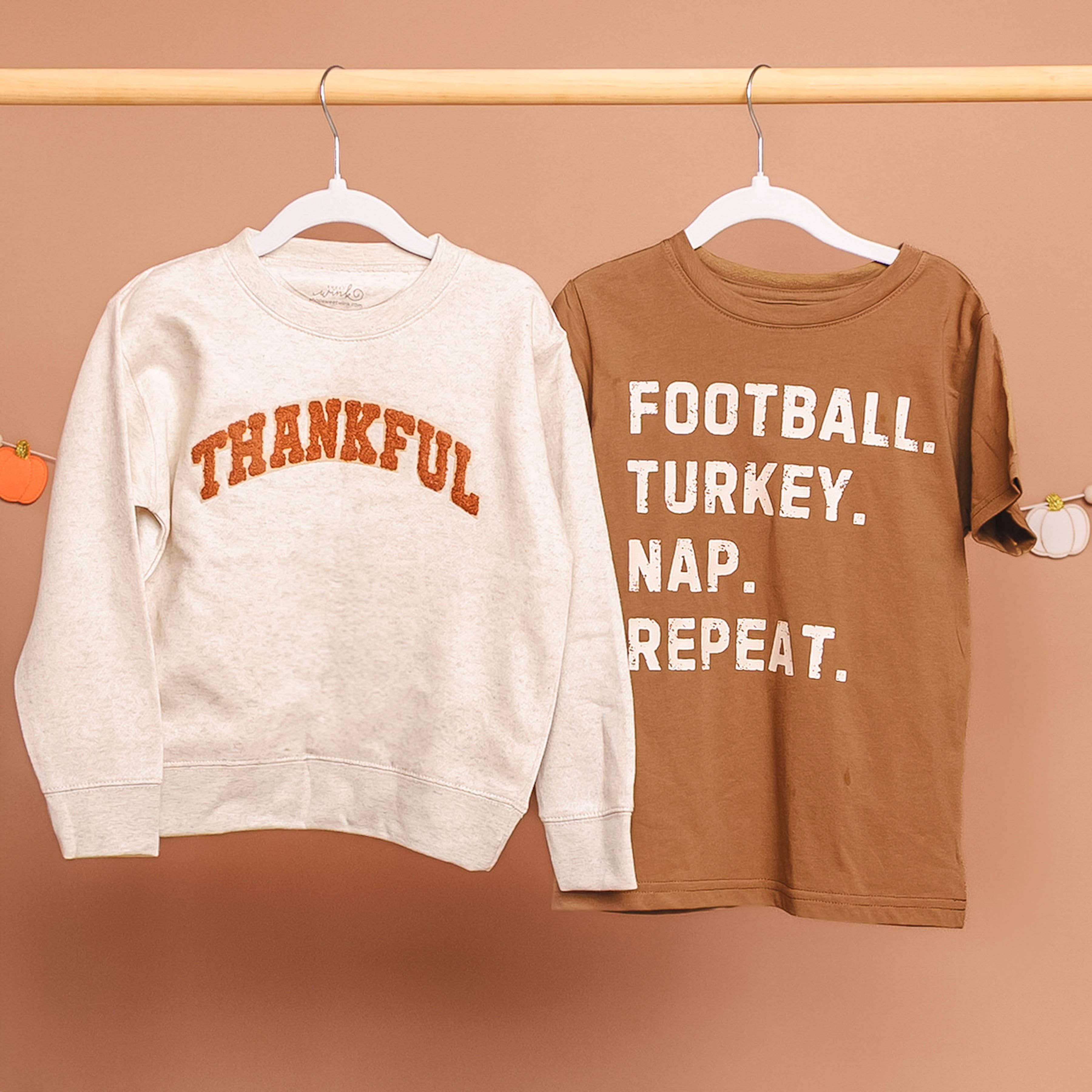 The Thankful Patch Varsity Thanksgiving Sweatshirt is a fun and festive sweatshirt for celebrating Thanksgiving! Features: