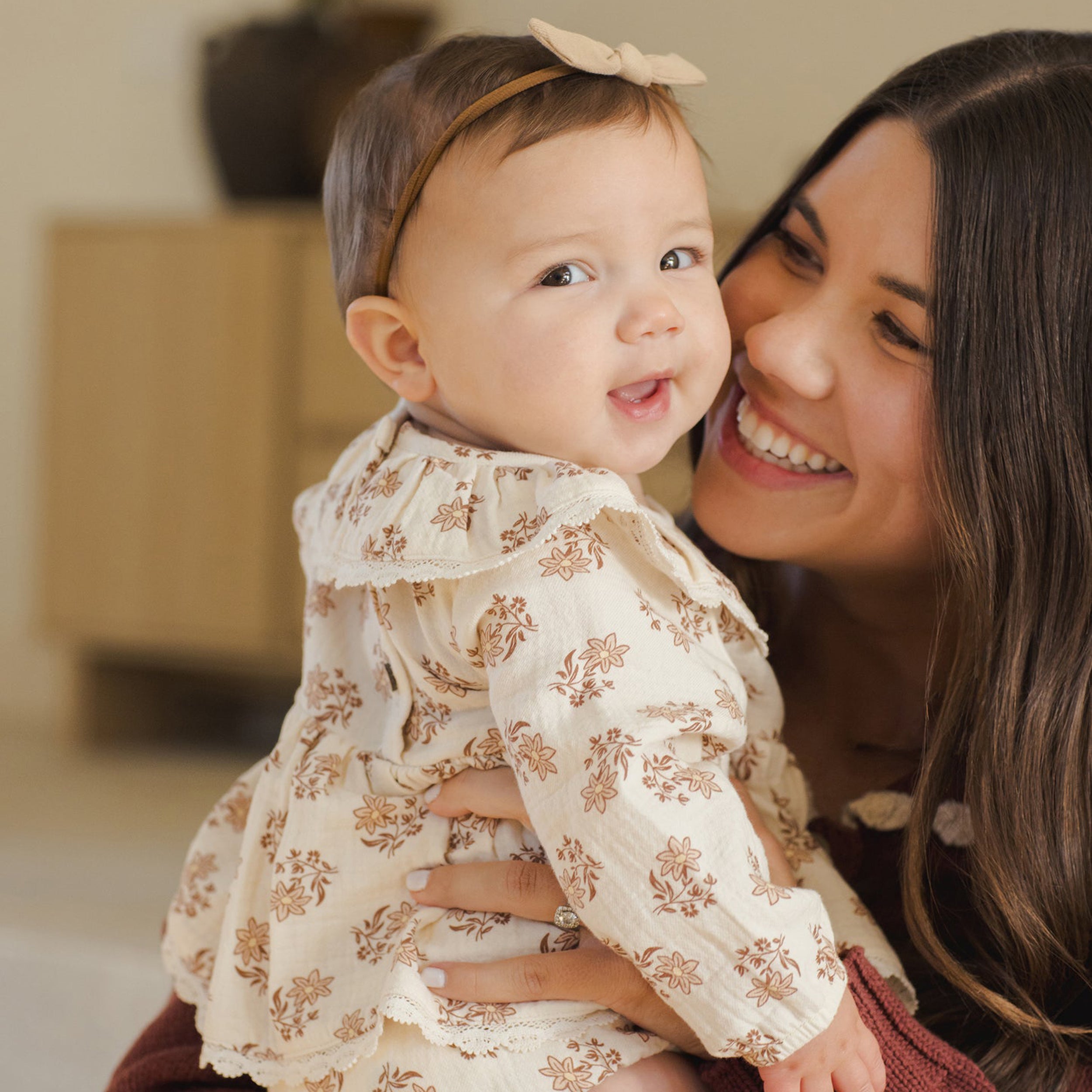 Our Thalia Romper features a sweet collar, delicate lace trim, a gathered waist, coconut buttons down the back, and bottom snaps for easy changes.