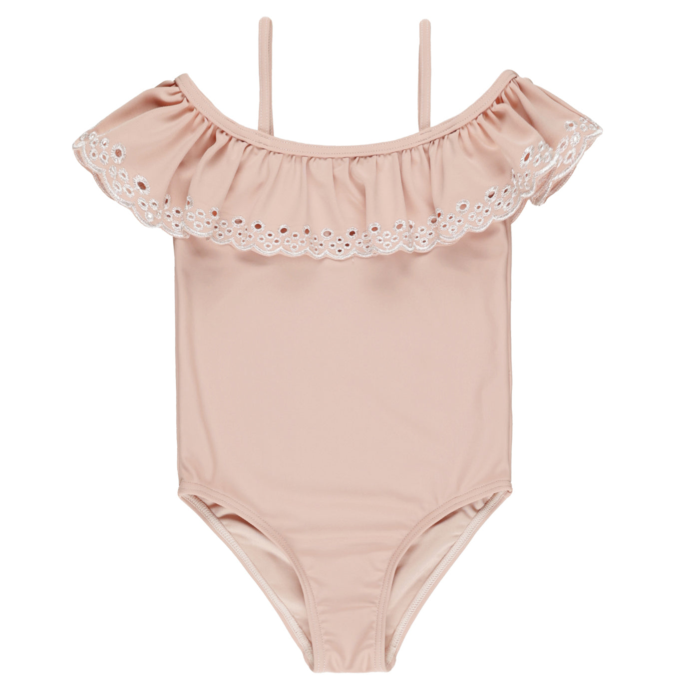 This girls one-piece bathing suit has an off-the-shoulder ruffle with scalloped eyelet trim detailing and simple spaghetti straps.