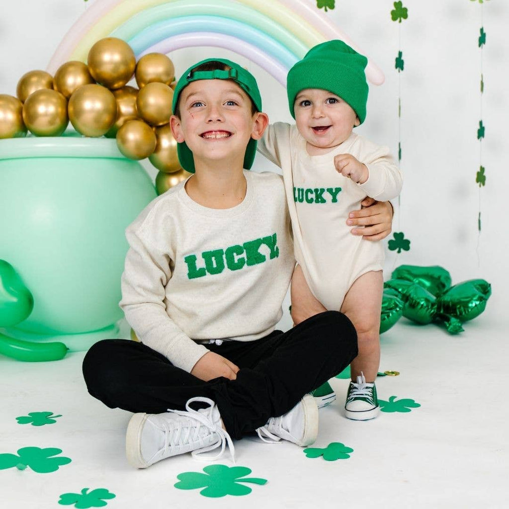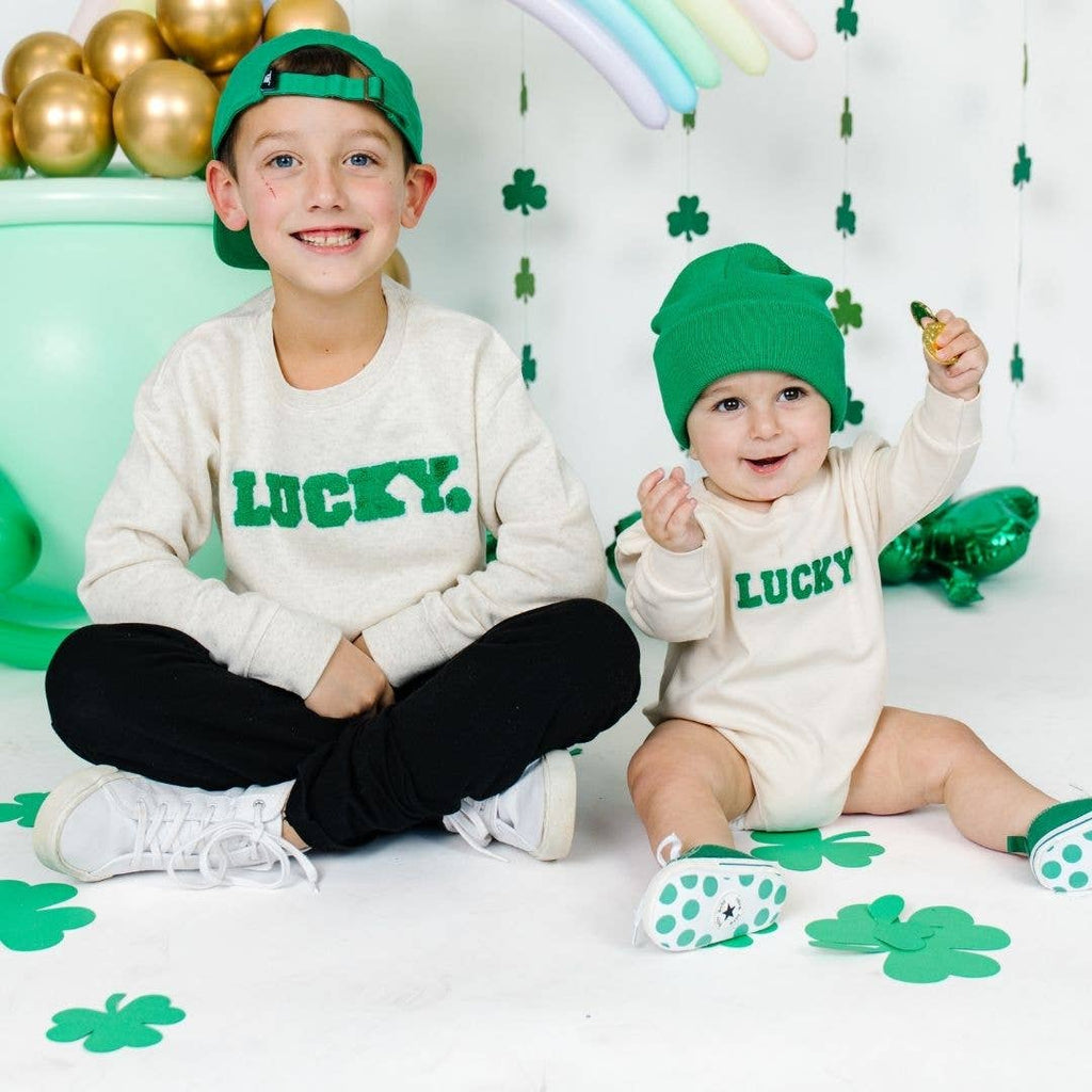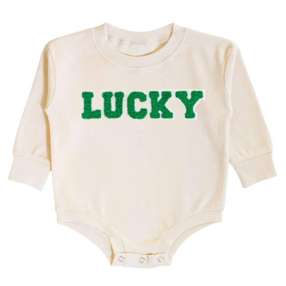 Lucky Varsity Patch St. Patrick's Day Long Sleeve Romper - Natural