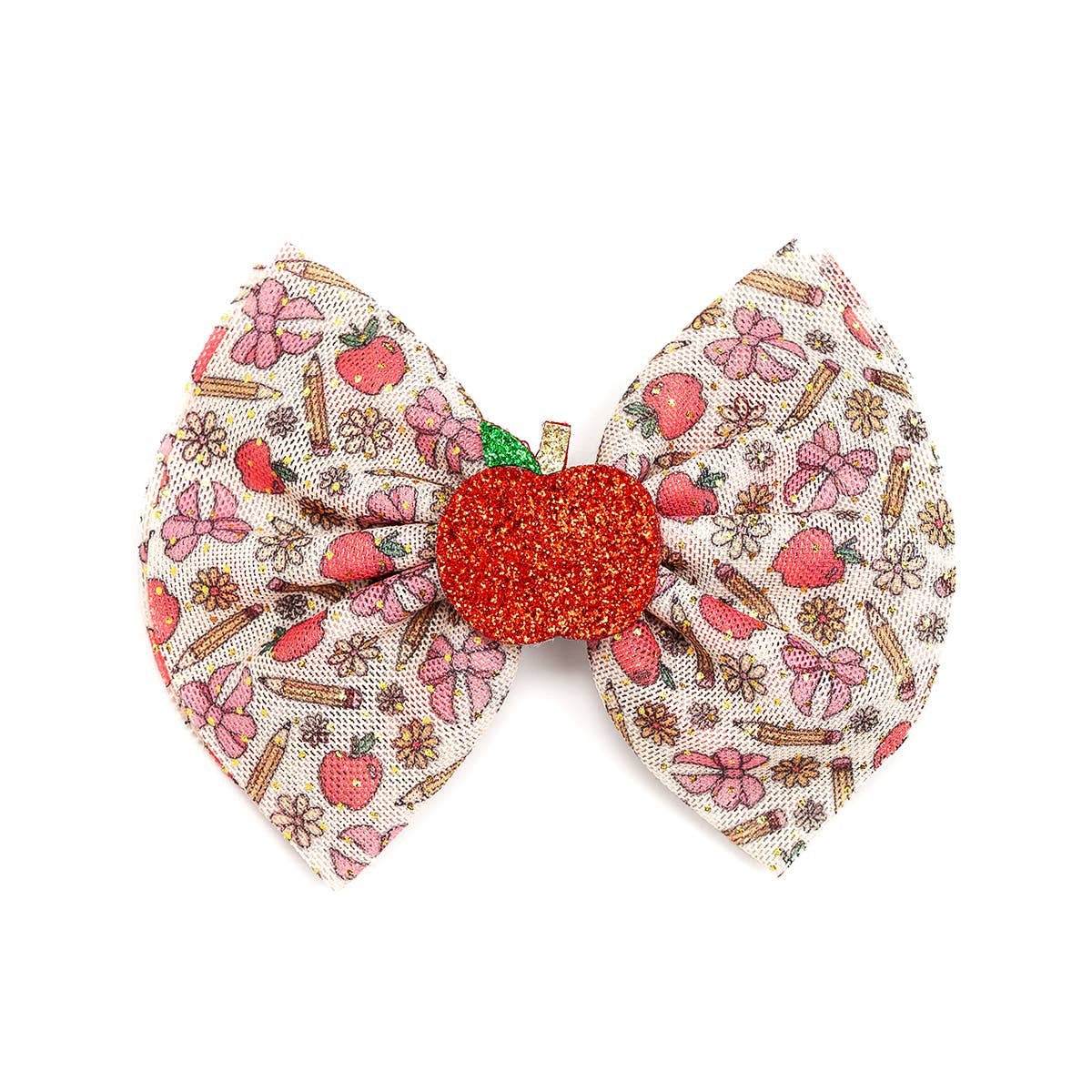 • Back to school printed tulle bow with gold glitter pin dot accents and a glitter apple motif