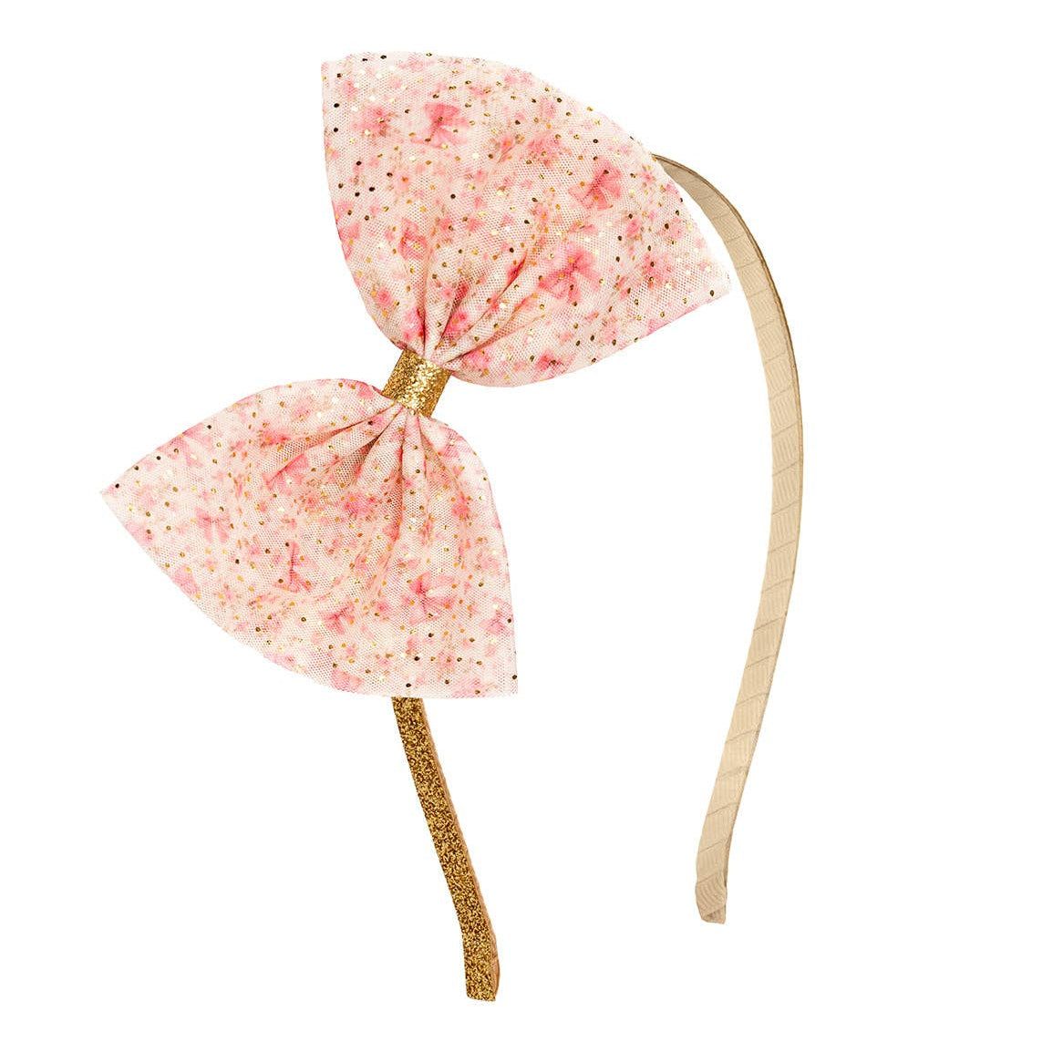 - Ditsy floral printed tulle bow with gold glitter pin dot accents