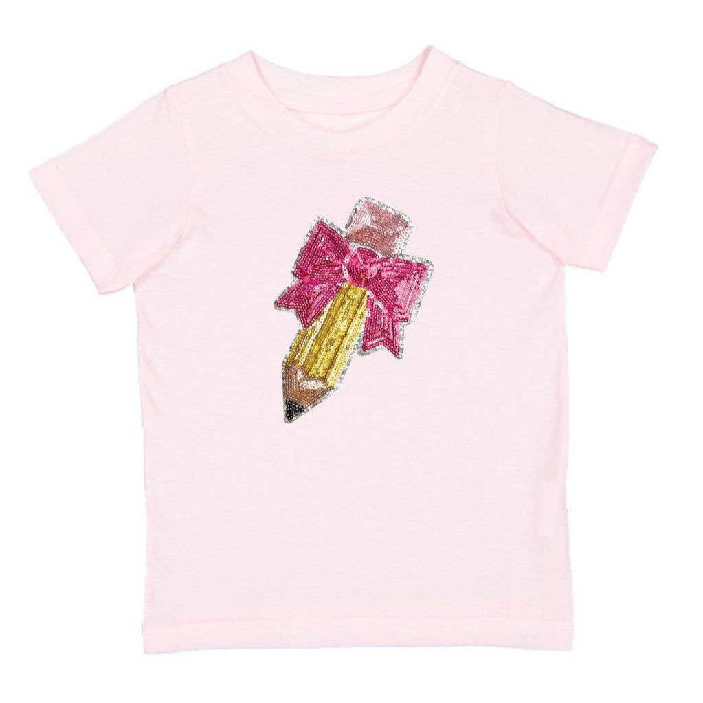 The Pencil Bow Sequin Patch Short Sleeve T-Shirt is a fun and cute t-shirt for kids celebrating back to school!