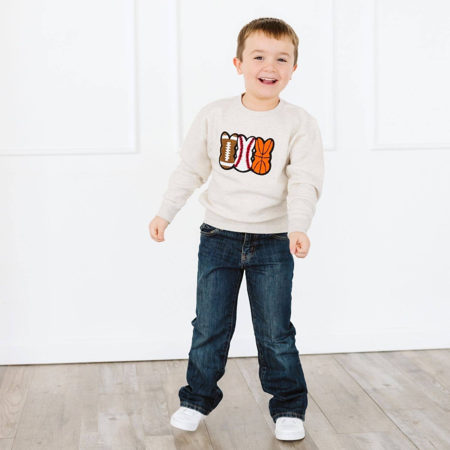 Score big this Easter with this cozy sweatshirt that features a fun trio of football, baseball, and basketball patches, perfect for your little athlete.
