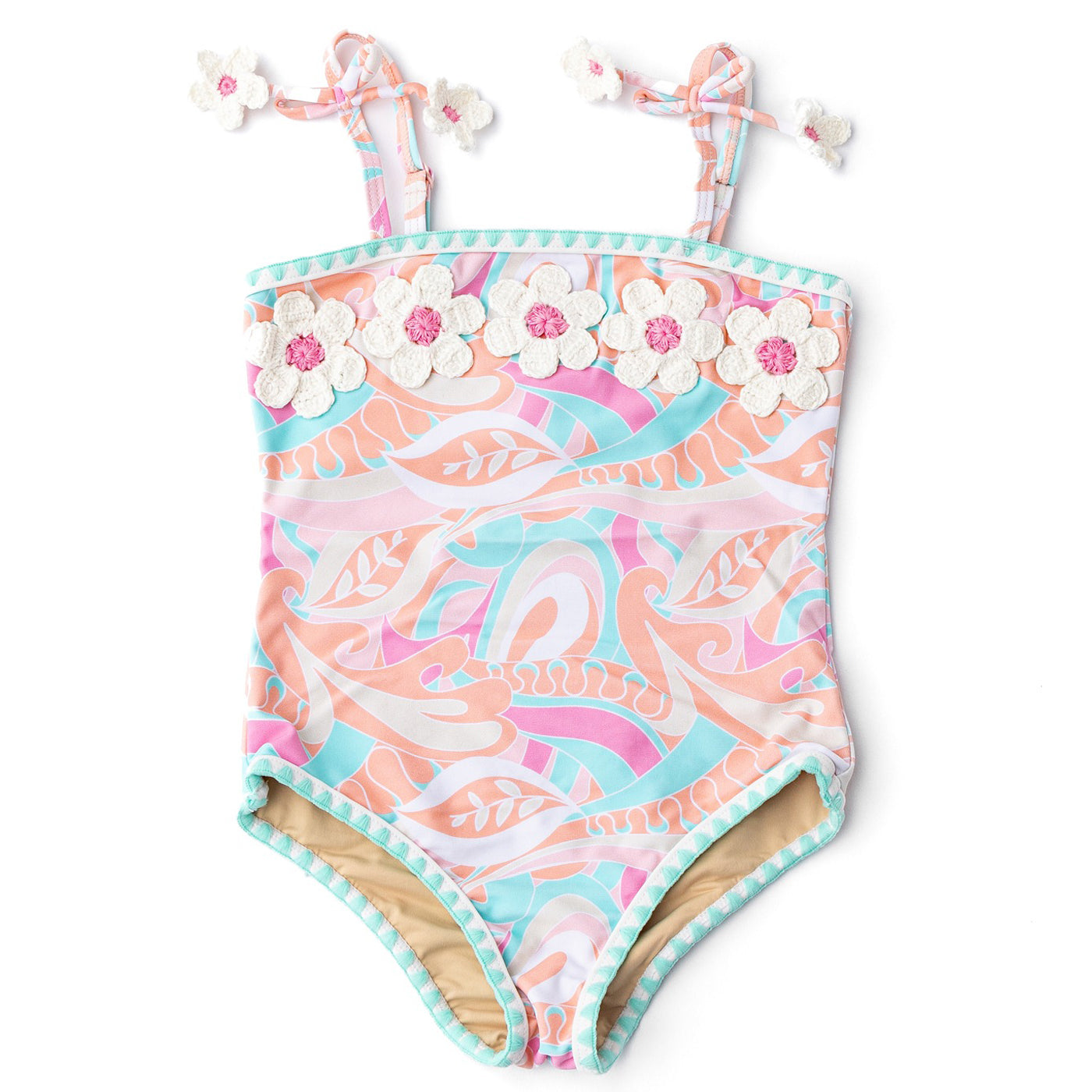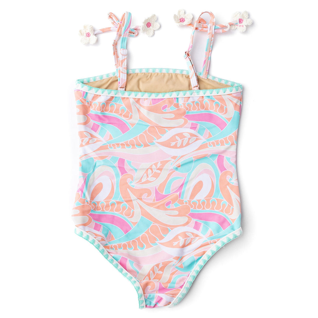 Your little one will turn heads with the Tutti Fruity Girls Crochet Pom Pom One Piece Swimsuit, a playful and stylish addition to her swimwear collection. Featuring adorable daisy danglers and intricate crochet detailing, this swimsuit is designed to capture the essence of fun and summer joy. The adjustable straps ensure a perfect, secure fit, while the full cut coverage keeps her comfortable as she enjoys the water.