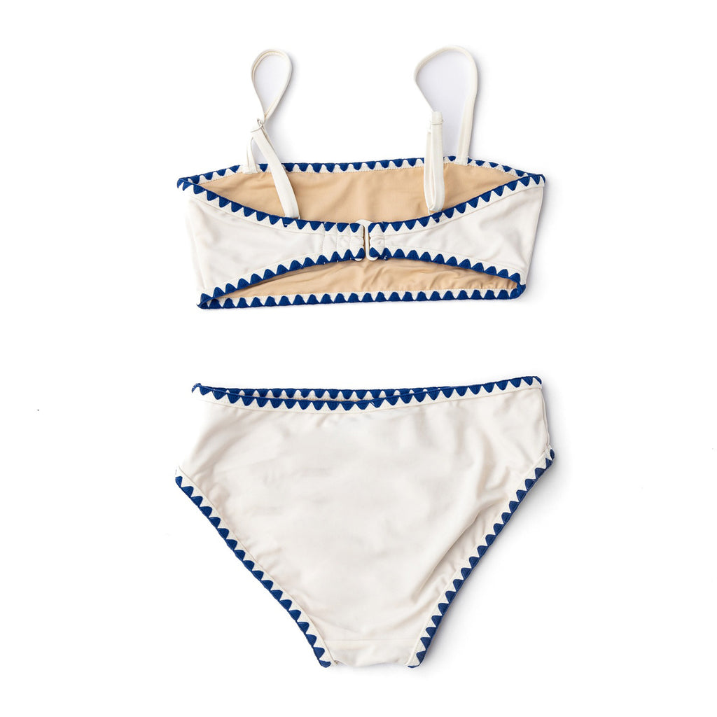 Runway worthy! Add a touch of timeless elegance to her swimwear collection with the White & Navy Girls Embroidered Two Piece Swimsuit. This beautifully crafted set features delicate embroidery detailing on the top and bottom, bringing a charming, feminine flair to her sunny-day style. The adjustable straps ensure a perfect, secure fit, while the full cut coverage provides comfort and confidence for all her water activities.